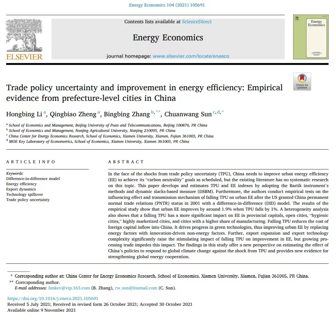 近日,我院博士生导师张兵兵副教授(通讯作者)研究成果“Trade policy uncertainty and improvement in energy efficiency: Empirical evidence from prefecture-level cities in China”(Voulme104,November2021)在SSCI来源期刊Energy Economics在线发表。