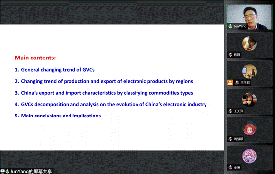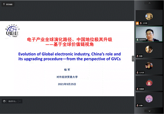 2021年11月25日下午两点,应437必赢会员中心邀请,对外经济贸易大学国际经济贸易学院杨军教授作题为“中国电子产业发展路径、全球地位与转型升级——基于全球价值链视角”的线上学术报告,吸引了师生的广泛关注与参与。