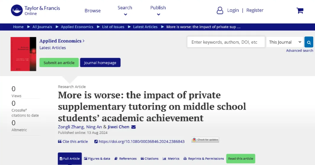 我院张宗利老师(第一作者)、安宁博士生、陈技伟老师(通讯作者)合作的研究成果“More is worse: the impact of private supplementary tutoring on middle school students’ academic achievement”发表于应用经济学国际期刊Applied Economics。