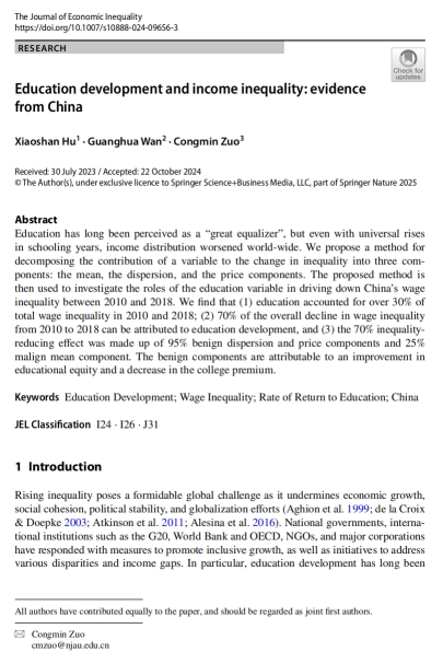 近日,我院左丛民老师(通讯作者)与合作者万广华教授、胡晓珊老师的合作研究成果“Education development and income inequality: evidence from China”(作者按姓氏首字母序排列)在收入分配领域知名国际期刊Journal of Economic Inequality在线发表。