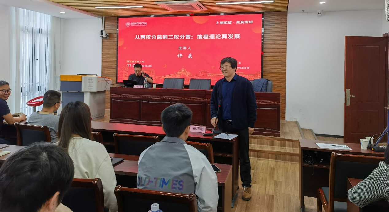 报告伊始,许教授先讲授了地租理论,回顾了威廉配第、亚当斯密、大卫·李嘉图和马克思对地租的理解,并对中华人民共和国成立以来到现在土地租金发展历程进行了分析,帮助学生生动形象理解相关理论。