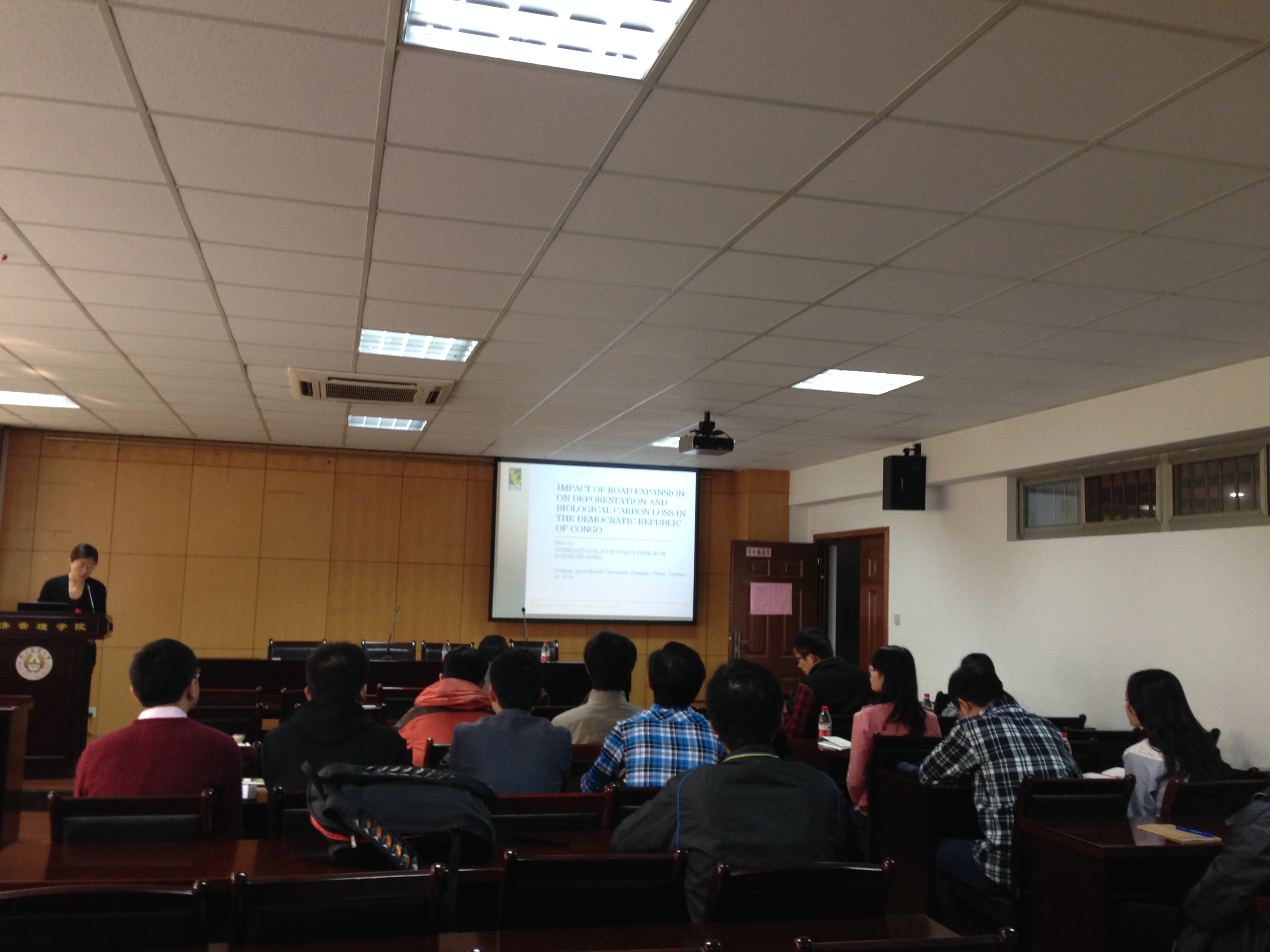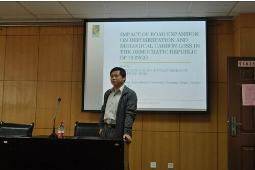 10月22日上午9点,国际食物政策研究所研究员李曼博士来我院作题目为“Impact of Road Expansion on Deforestation and Biological Carbon Loss in the Democratic Republic of Congo”的讲座,报告主要围绕刚果(金)道路扩张对森林砍伐以及碳流失的影响展开,我院周曙东教授主持讲座,耿献辉副院长参加了讲座。