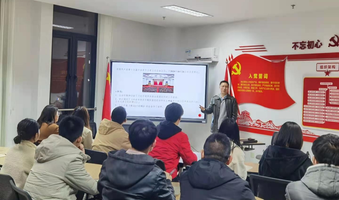 会上,展进涛老师主要为大家讲解了十二点规划以及八大远景目标的具体内容。他指出,坚持党的全面领导、坚持以人民为中心、坚持新发展理念、坚持深化改革开放、坚持系统观念是“十四五”时期经济社会发展必须遵循的原则。同时展老师也对当前的粮食安全、科技创新、乡村振兴等问题进行了相关的解读。他指出,学生党员要把握宏观形势,紧跟时代,了解并学习新词汇、新思想、新内容,并尝试将其与农业相关研究相结合,真正做到理论联系实践。