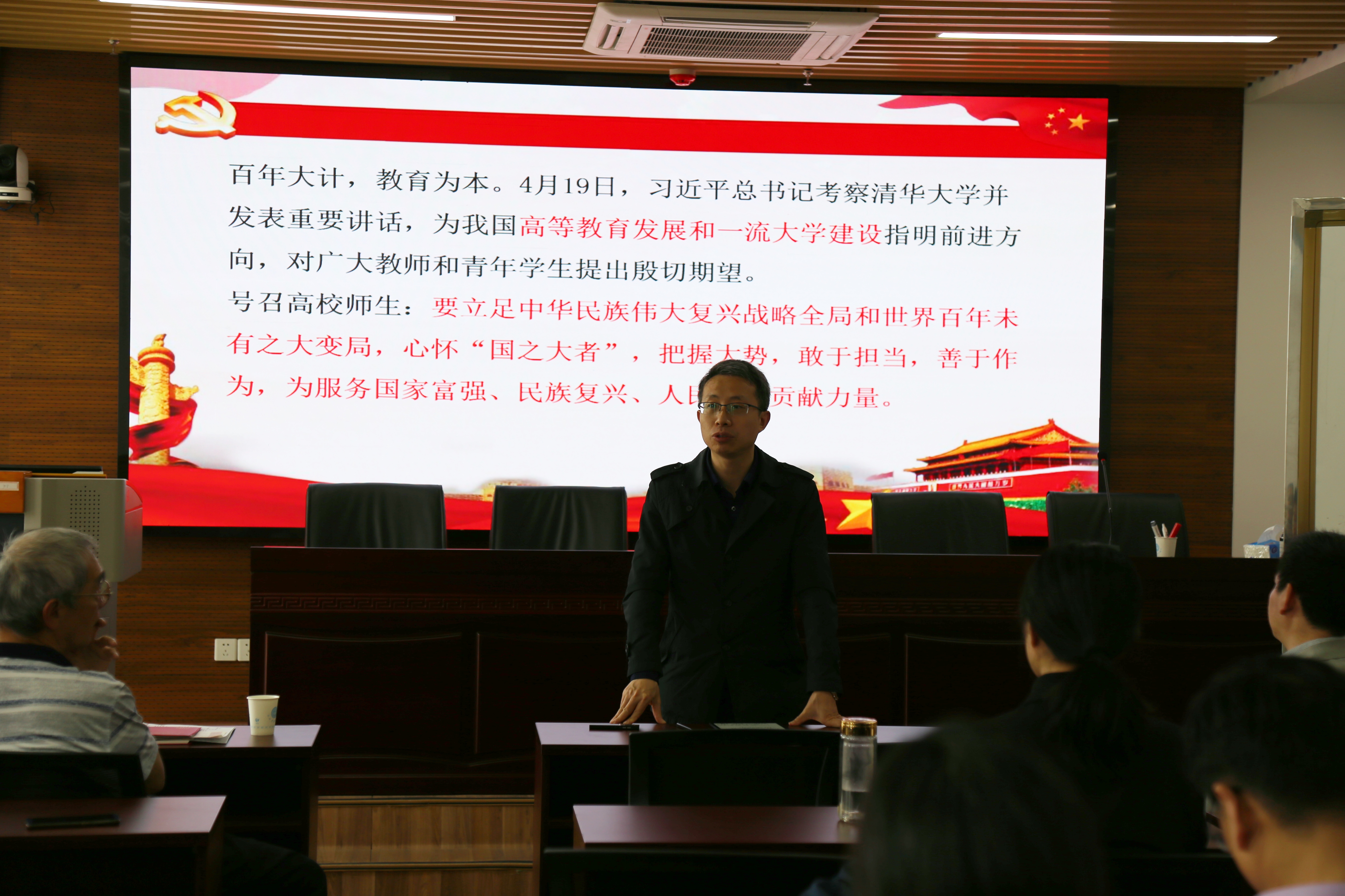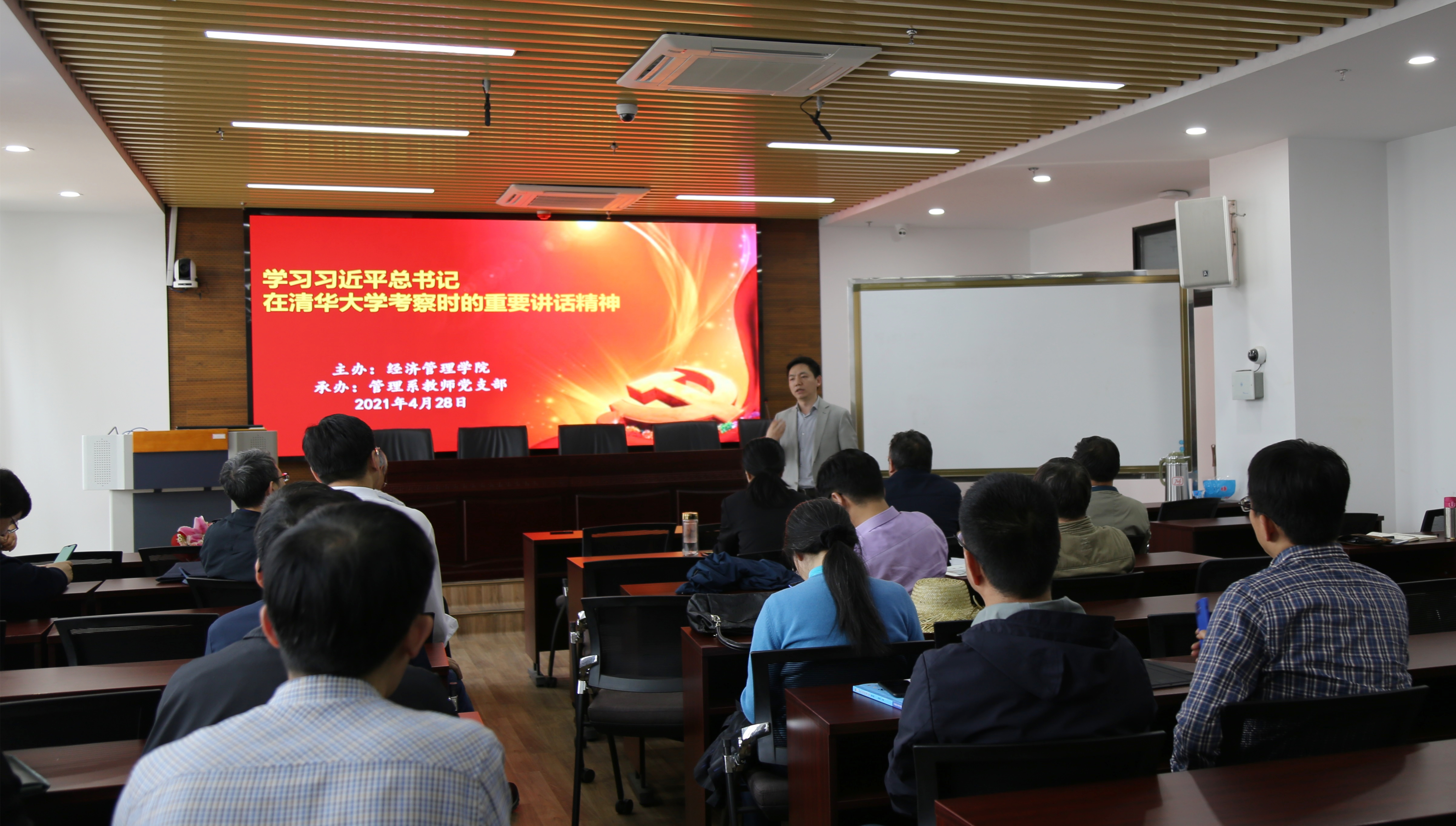 4月28日下午,管理系教师党支部组织习近平总书记在清华大学考察时的重要讲话精神专题学习。院党委书记姜海、副院长林光华、学院教师等30余人参加了集体学习。