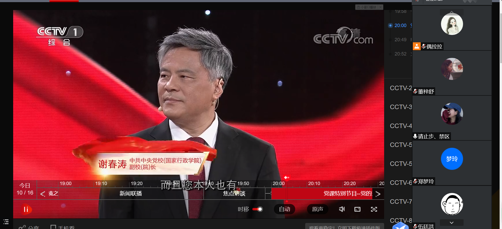 为深入学习贯彻习近平总书记在庆祝中国共产党成立100周年大会上的重要讲话精神,中央组织部、中央广播电视总台联合录制了《党课开讲啦》节目。第1期《党的光辉历程》(中央党校副校长谢春涛主讲)于10月16日(星期六)晚间8点档在中央电视台综合频道(CCTV-1)播出,437必赢会员中心各学生党支部积极组织观看学习,并展开讨论交流。