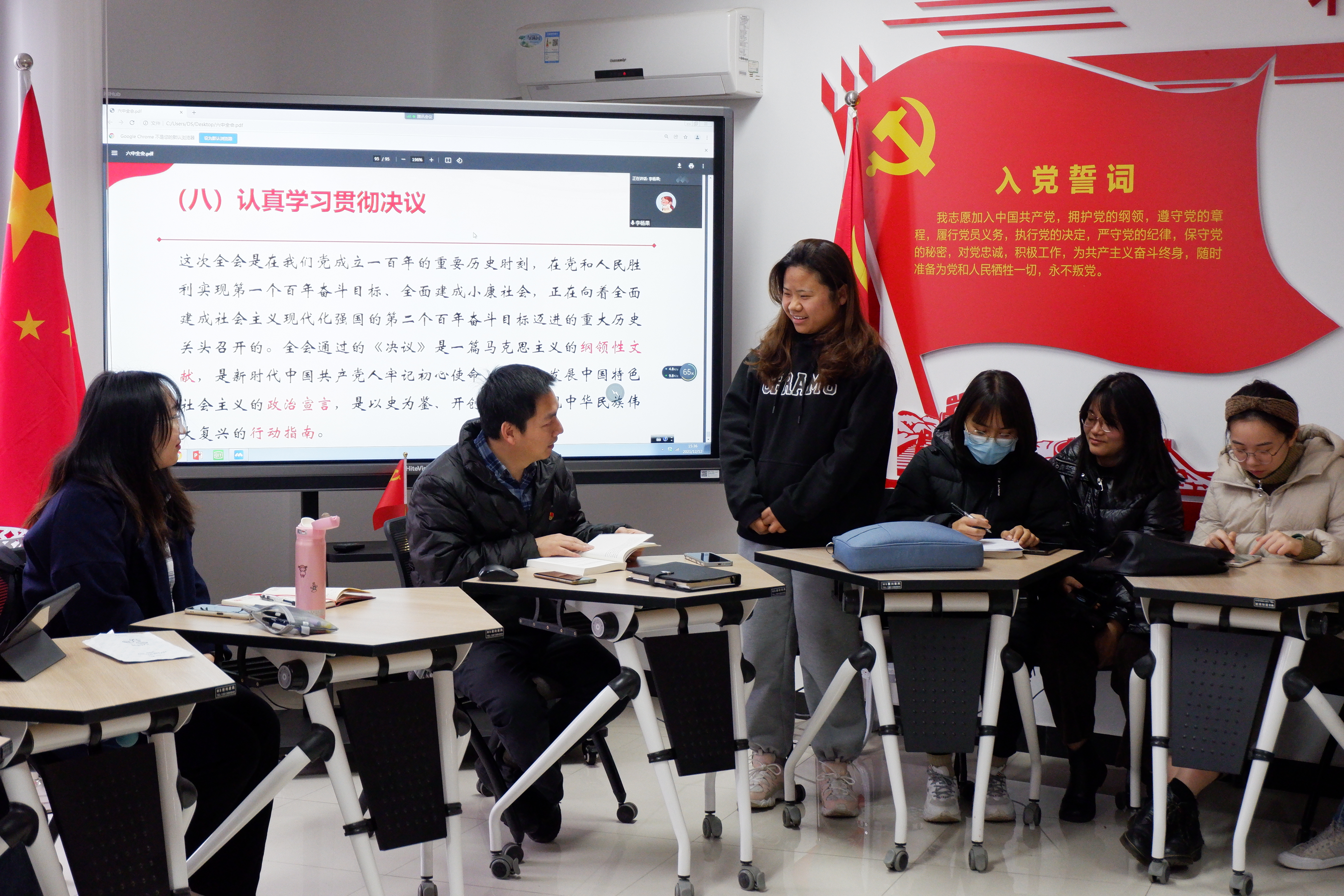 首先,林光华教授从党的十九届六中全会的重大意义、精神要点、贯彻落实三方面进行了系统的讲解。结合近期对党的十九届六中全会精神的学习与感悟,林光华为支部上了一堂别开生面的党课,并以此号召大家要提高思想觉悟,为实现中华民族伟大复兴而努力奋斗。之后,积极分子左若男与正式党员李阳结合近期党的十九届六中全会精神的自学情况与大家分享了心得体会。