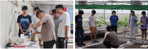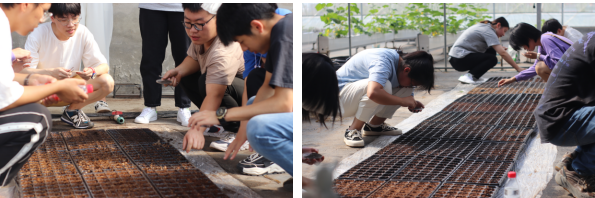 在实践环节,活动成员参与了莴苣、甘蓝和生菜的播种工作。依照实验员的指导,在480种不同土壤基质上,依次完成了三类种子的播种铺土及浇水等工作。通过实地体验劳动教育,调动了同学们投身三农事业的积极性和主动性。成员们相约作物成熟时,再次来此学习和实践。