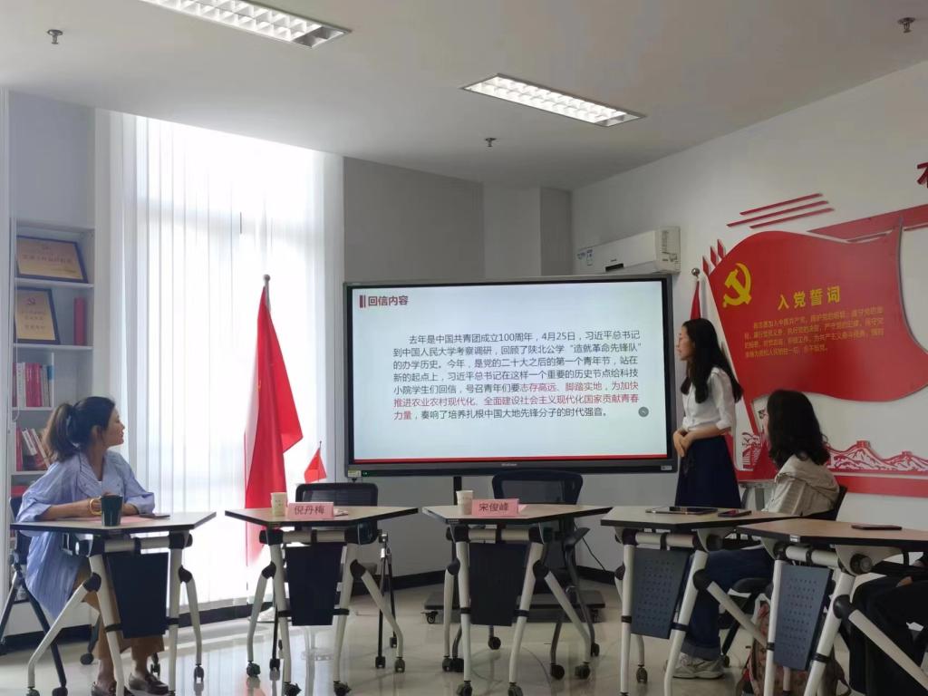 然后,由支部党员吕艾阳同志带领大家集体学习贯彻“习近平总书记给中国农业大学科技小院学生重要回信精神”,强调青年学生们将课堂学习和乡村实践相结合、有敢于“自找苦吃”精气神的重要性。党员们纷纷就此内容结合自身实际交流感想,曹牧云同志联系自己毕业后将奔赴一线、深入实践一事,表示对于习近平总书记回信精神中的“自找苦吃”的精气神十分共鸣,并会坚定信仰、勇毅行动。