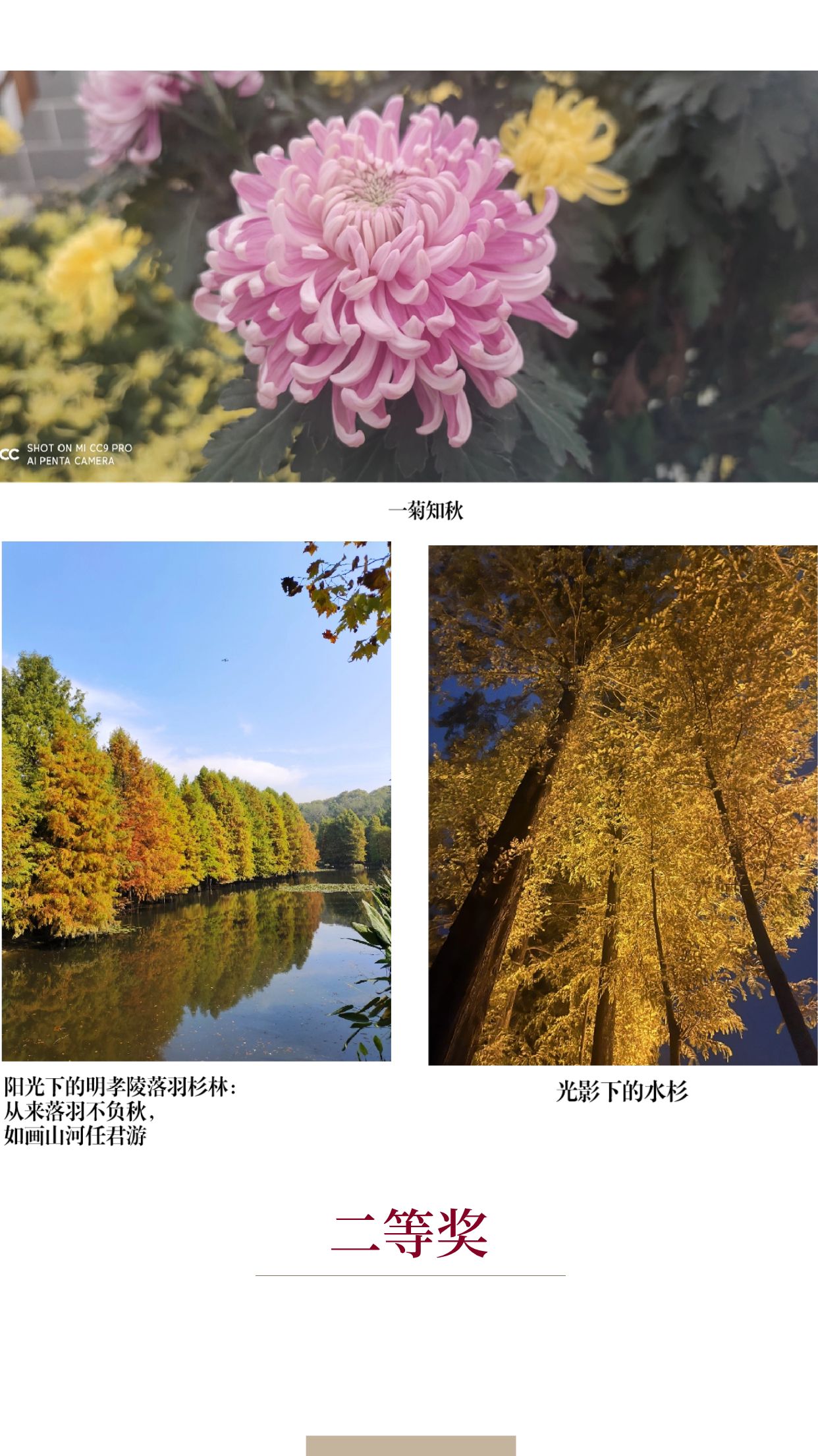 近日,学院工会组织全院教职工开展了“发现金陵之美、典藏秋韵秋景”主题摄影比赛。本次比赛为学院首次开展,得到了广大教职工的积极参与。在院党委和院领导班子大力支持下,广大教职工踊跃参与,提交金陵秋景、菊花秋韵、校园风景、自然景观等不同体裁的作品。