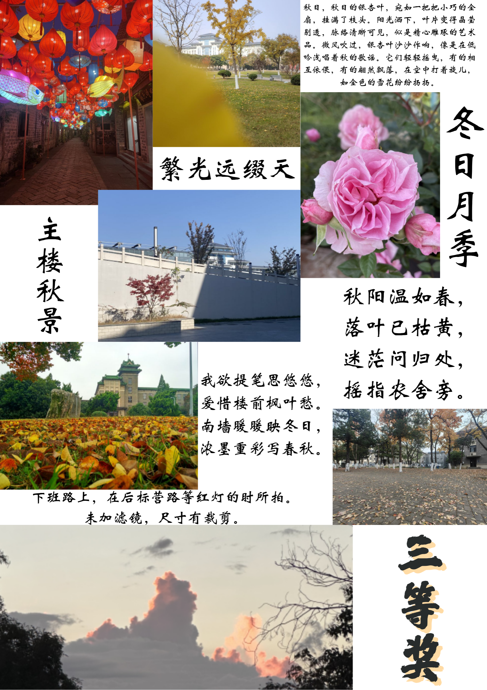 秋收冬藏,生命美好。傍晚与暖黄路灯相辉映的落叶,校园里互相追逐的小猫们,或是主楼飘然而下的梧桐树叶……生活中每一处,每一个瞬间,每一个精致,都可以成为值得用相片定格的美好。为丰富全体教职工的假期生活,在发现与记录的过程中创造属于自己的美好光影生活,近日,学院工会组织全院教职工开展了“最美时光 ”主题摄影大赛。