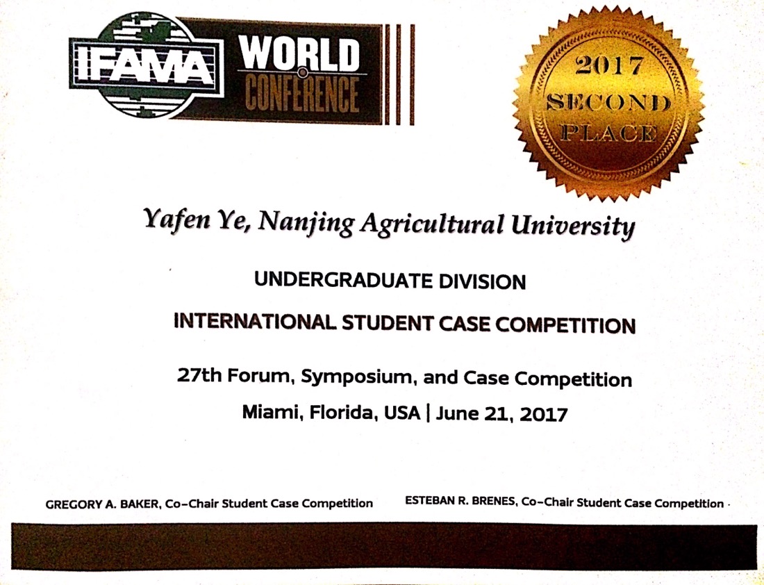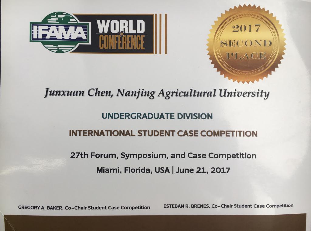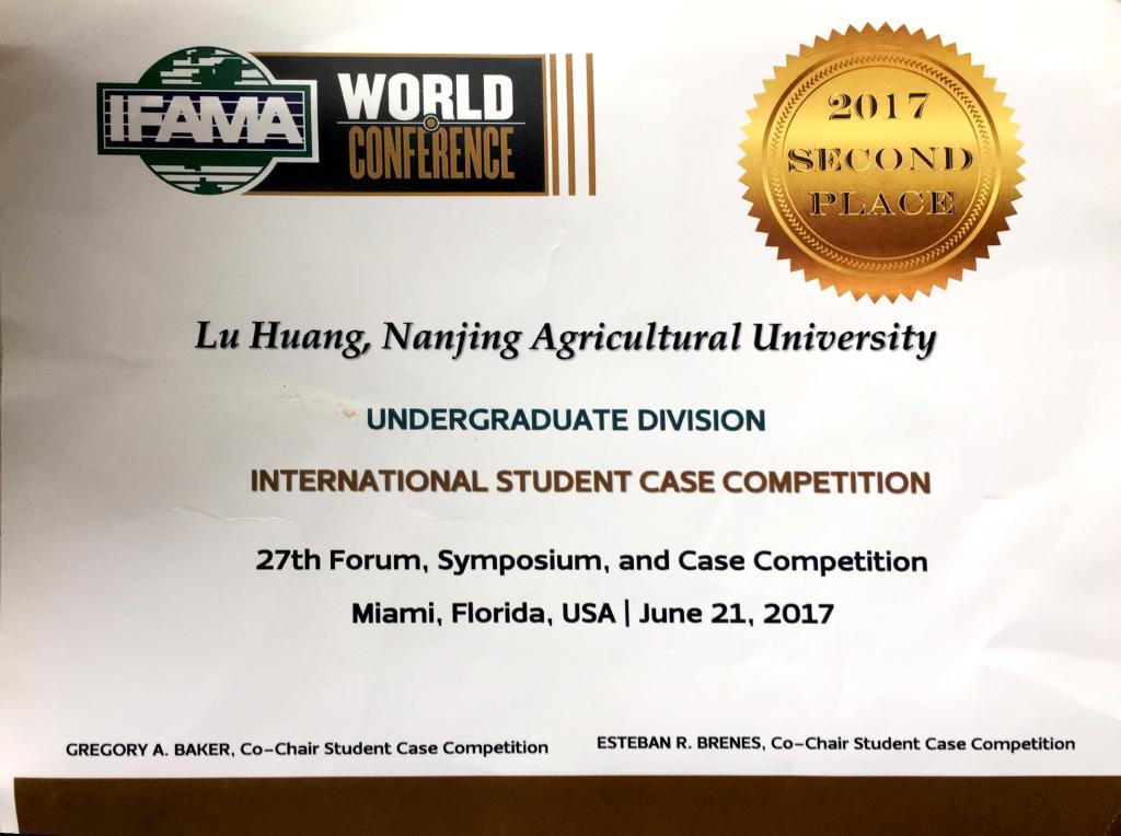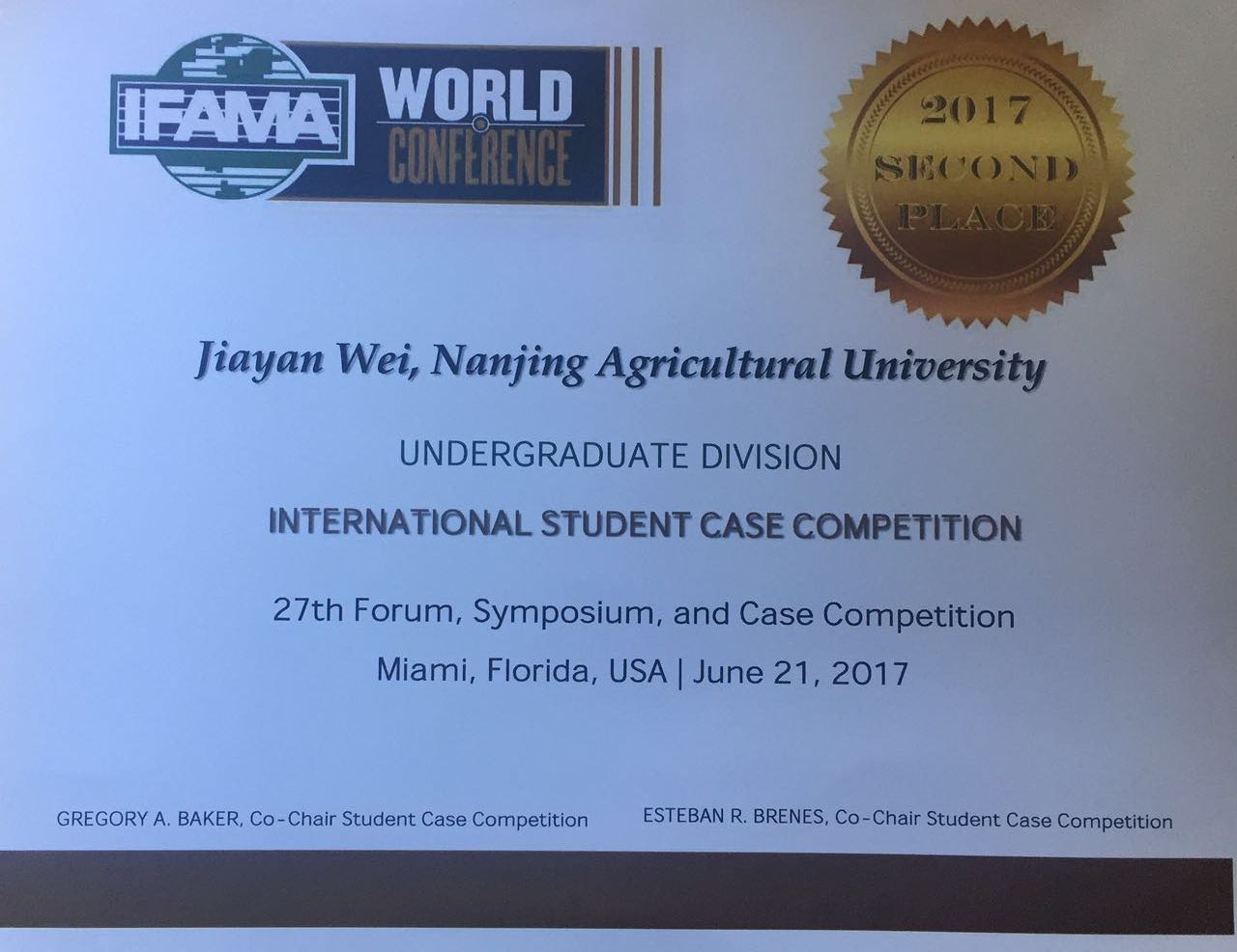 国际食品与农业企业管理协会(International Food and Agribusiness Association,简称IFAMA)第27届年度论坛与研讨会于6月18日至21日在美国迈阿密举行。bwi437官网经管学院继连续三次取得佳绩后,在今年的案例竞赛中,由学院蔡忠州教授、朱战国副教授培训并指导的韦佳彦、黄鹭、叶娅芬、陈俊璇等四位本科生组成的代表队赴美参加2017IFAMA国际学生案例竞赛,与25个世界名校参赛队伍同场竞技,再传捷报,荣获本科生组亚军。