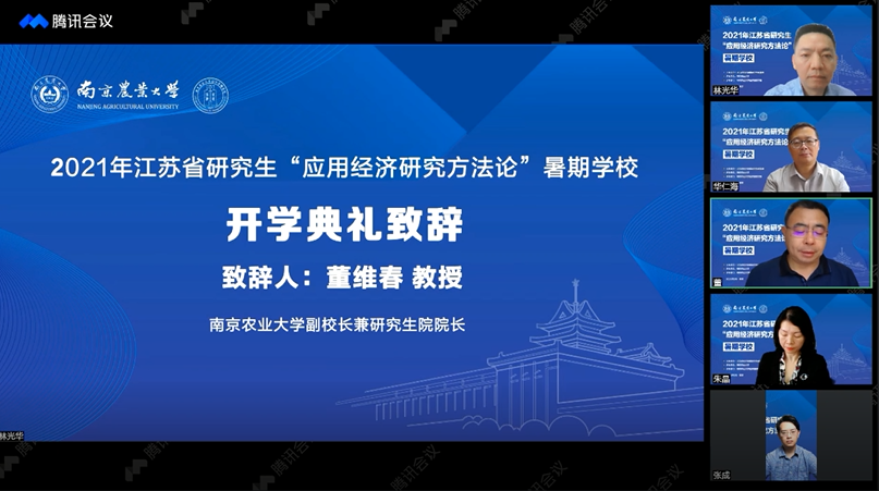 8月20日上午,2021年江苏省研究生“应用经济研究方法论”暑期学校在我校举行在线开学典礼。本次暑期学校由江苏省经济类研究生教育指导委员会主办、bwi437官网承办,437必赢会员中心负责组织实施。江苏省经济学类研究生教指委主任、南京财经大学副校长华仁海教授,bwi437官网副校长兼研究生院院长董维春教授,江苏省经济学类研究生教指委秘书长、南京财经大学金融学院院长张成教授,437必赢会员中心院长朱晶教授等领导和嘉宾出席开幕式。来自北京大学、南京大学、浙江大学、中国人民大学、中国农业大学等全国100多所高校的519名研究生正式学员线上参加了开幕式。开幕式由437必赢会员中心副院长林光华教授主持。