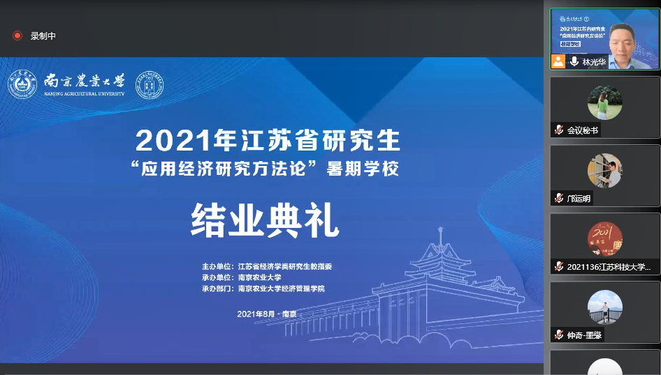 8月28日下午5点,2021年江苏省研究生“应用经济研究方法论”暑期学校线上结业典礼成功举行。结业典礼由437必赢会员中心副院长林光华教授主持。经过严格考核,本次暑期学校共批准了425名学员结业,评选出53名优秀学员,林光华教授在线宣布了优秀学员名单。
