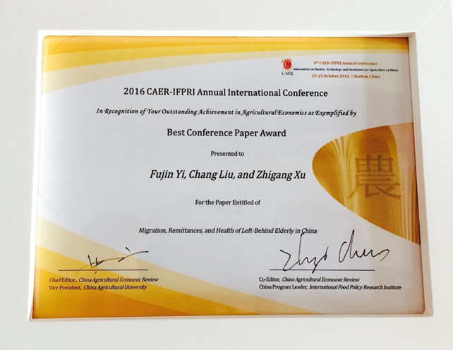 我院易福金教授、徐志刚教授和博士生刘畅的论文《Migration,Remittances and Health of Left-Behind Elderly in China》荣获本届年会最佳论文奖。此次年会从参会的42篇论文中共评出2篇最佳会议论文。