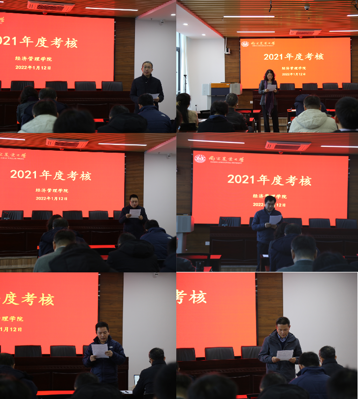 第二阶段,领导干部进行述职汇报,党委组织部何旭老师参会指导。党委书记姜海、院长朱晶、班子成员宋俊峰、耿献辉、林光华、易福金依次作本年度述职汇报。述职结束后,学院教职工对领导干部进行民主测评。