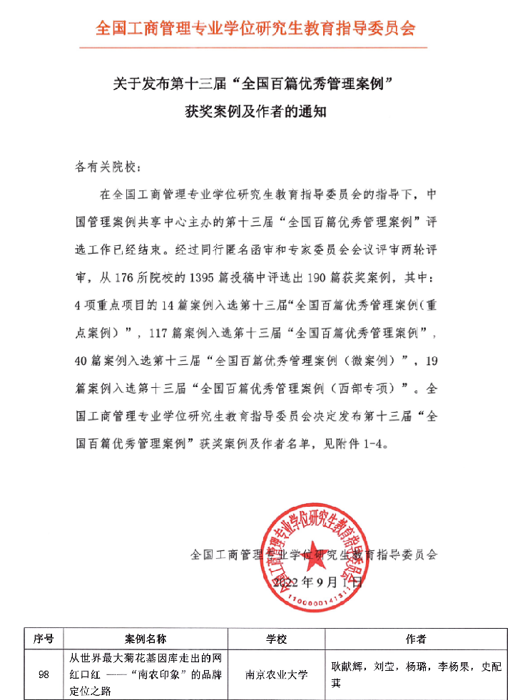 2022年8月15-16日,在全国工商管理专业学位研究生教育指导委员会的指导下,第十三届“全国百篇优秀管理案例”评选专家评审会顺利召开并揭晓了最终评选结果。437必赢会员中心耿献辉教授、刘莹老师、杨璐副教授、李杨果、史配萁等师生联合开发的教学案例“从世界最大菊花基因库走出的网红口红——‘南农印象’的品牌定位之路”从全国900余篇投稿案例中脱颖而出,成功入选第十三届“全国百篇优秀管理案例”之一。