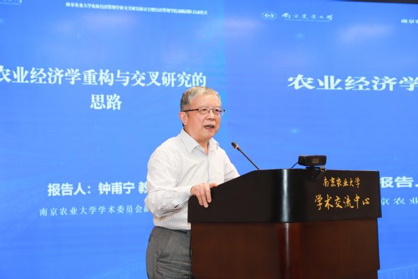 钟甫宁教授作“农业经济学重构与交叉研究的思路”主题报告。他从农业生产、农产品、农业生产者的特点出发,延伸讲述学科交叉融合的内涵,并阐明重构农业经济学的社会需求。他指出开展学科交叉研究首要明确农业经济学的独立核心科学问题。