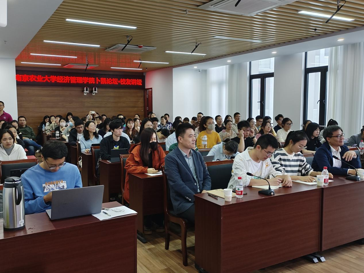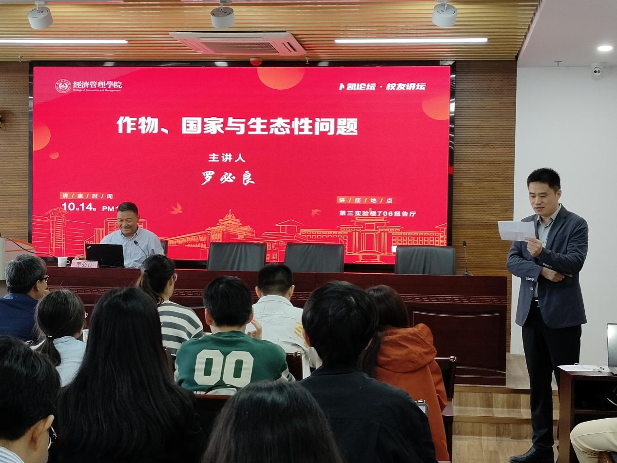 10月14日下午,学院“卜凯论坛•校友讲坛”第2期在第三实验楼706报告厅举办。此次,学院特邀华南农业大学文科资深教授、国家农业制度与发展研究院院长、教育部特聘教授罗必良作题为“作物、国家与生态性问题”的学术报告。学院书记孙雪峰主持报告会,纪月清教授担任互动嘉宾,学院师生80余人现场参加。