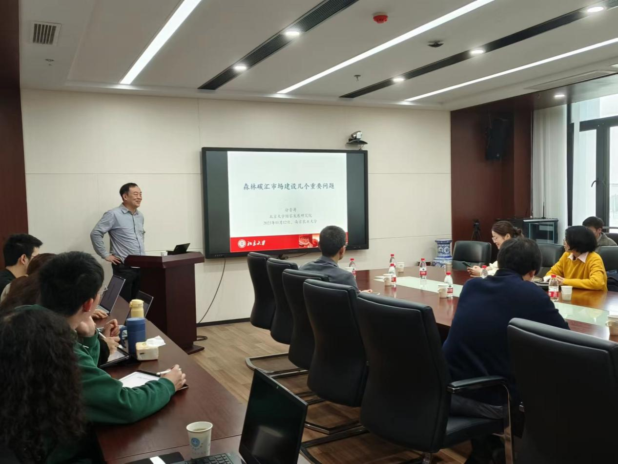 2023年11月12日上午9时,学院“卜凯论坛•校友讲坛”第6期在第三实验楼716报告厅举办。此次,学院特邀北京大学国家发展研究院教授、副院长徐晋涛教授作题为“关于森林碳汇市场建设几个重要问题的讨论”的学术报告。学院徐志刚教授主持报告会,学院师生20余人现场参加。