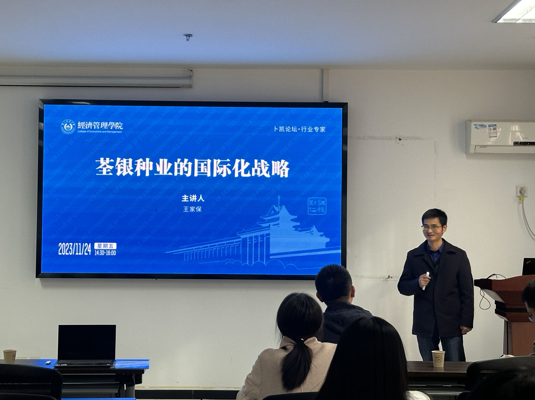 2023年11月24日下午,学院“卜凯论坛•行业专家”报告在第三实验楼1101报告厅举办。此次,学院特邀安徽荃银种业科技有限公司党支部书记/副总经理王家保先生作题为“荃银高科种业国际化战略与种业国际贸易现状”的行业报告。学院田曦教授主持报告会,学院师生20余人现场参加。
