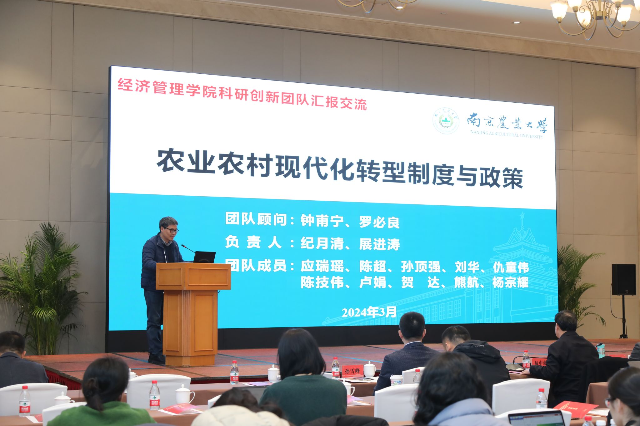 纪月清教授作农业农村现代化转型制度与政策团队汇报。他介绍了团队的研究方向、工作重点、工作成效以及2024年工作计划。他表示,团队运营一年来,除积极参与学院组织的团队交流活动之外,组织团队集体活动多次,围绕种业市场化改革、农业社会化服务发展、农村女性劳动参与等议题展开合作讨论若干次,广泛促进团队成员间相互交流与了解,探寻成员之间交叉合作空间,合作势头良好。