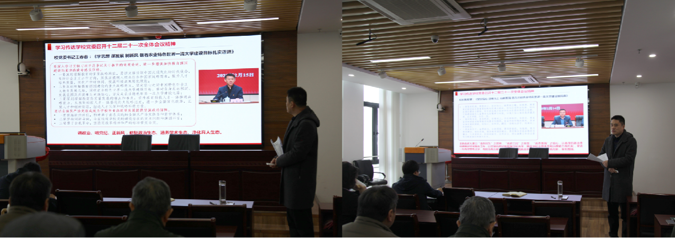 院党委书记孙雪峰向全院教职工传达了中共bwi437官网第十二届委员会第二十一次全体会议精神,重点传达了校党委书记王春春、校长陈发棣的大会报告精神。他强调经管学院深入学习贯彻校党委第二十一次全委会精神,构建了"三位一体"学习矩阵,学院党委理论学习中心组、教师党支部分别开展专题研学,围绕新学期大会精神,对标学院发展定位与规划深入研讨。