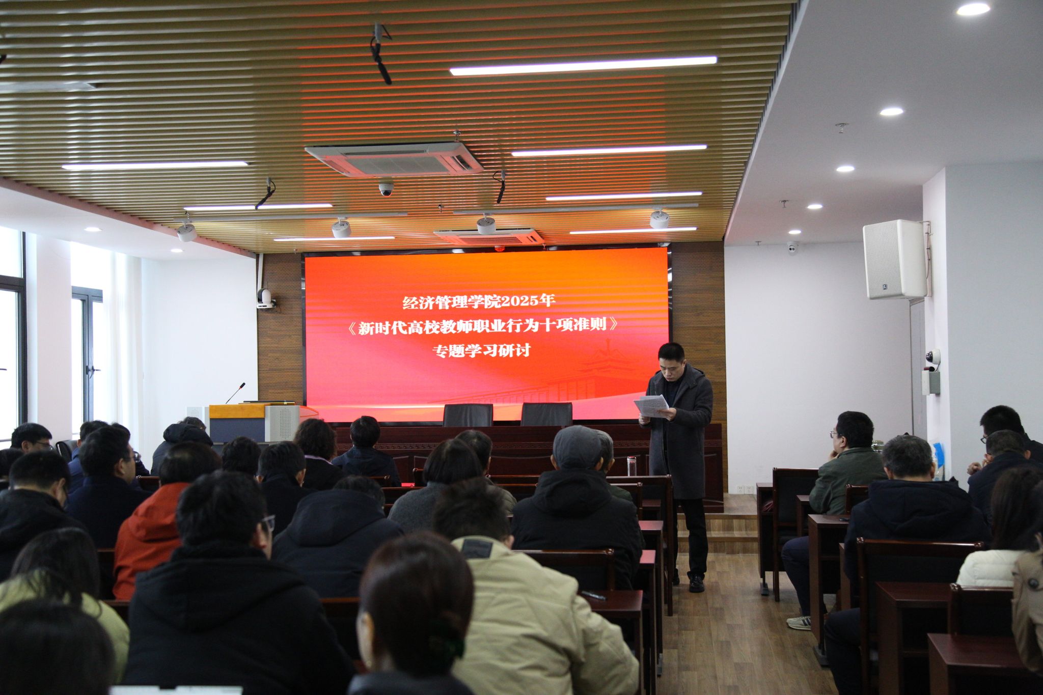 同时他聚焦师德师风,通过领学《新时代高校教师职业行为十项准则》,筑牢意识形态防线与风腐廉洁防线,强调课堂教学"学术规范与价值引领"双重要求。