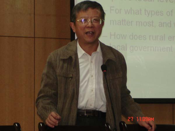 报告题为:Enterprise privatization,local government finance,and the provision of public goods in rural China.此次报告是专门针对硕博士研究生的,报告的模型中引入了Primary teacher/student ratio ,Primary school completion (graduation)rate,Middle school conpletion (graduation)rate ,Primary to middle school continuation rate ,senior centers per elderly(over age 65),senior patients per elderly (over age 65),Township hospital per capita,Township hospital staff per capita,Real per capita social relief expenditures,Real per capita poverty relief expenditures,Real per capita natural disaster relief exprnditures等变量,介绍了中国某些省市公共财政、社会服务、经济增长之间的相互关系,讲解清楚,深入浅出,并详细回答了各种问题,对同学们从事相关研究有很大的启发。来听该报告的除了硕博士研究生,还有许多老师。钟甫宁老师对报告作了总结。