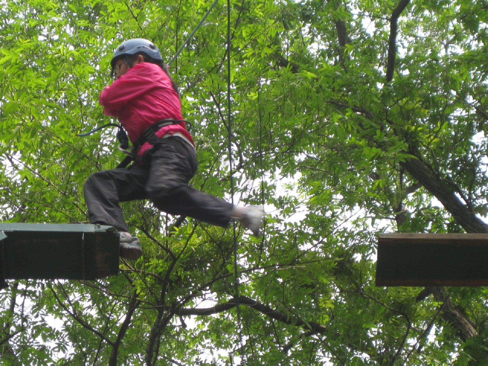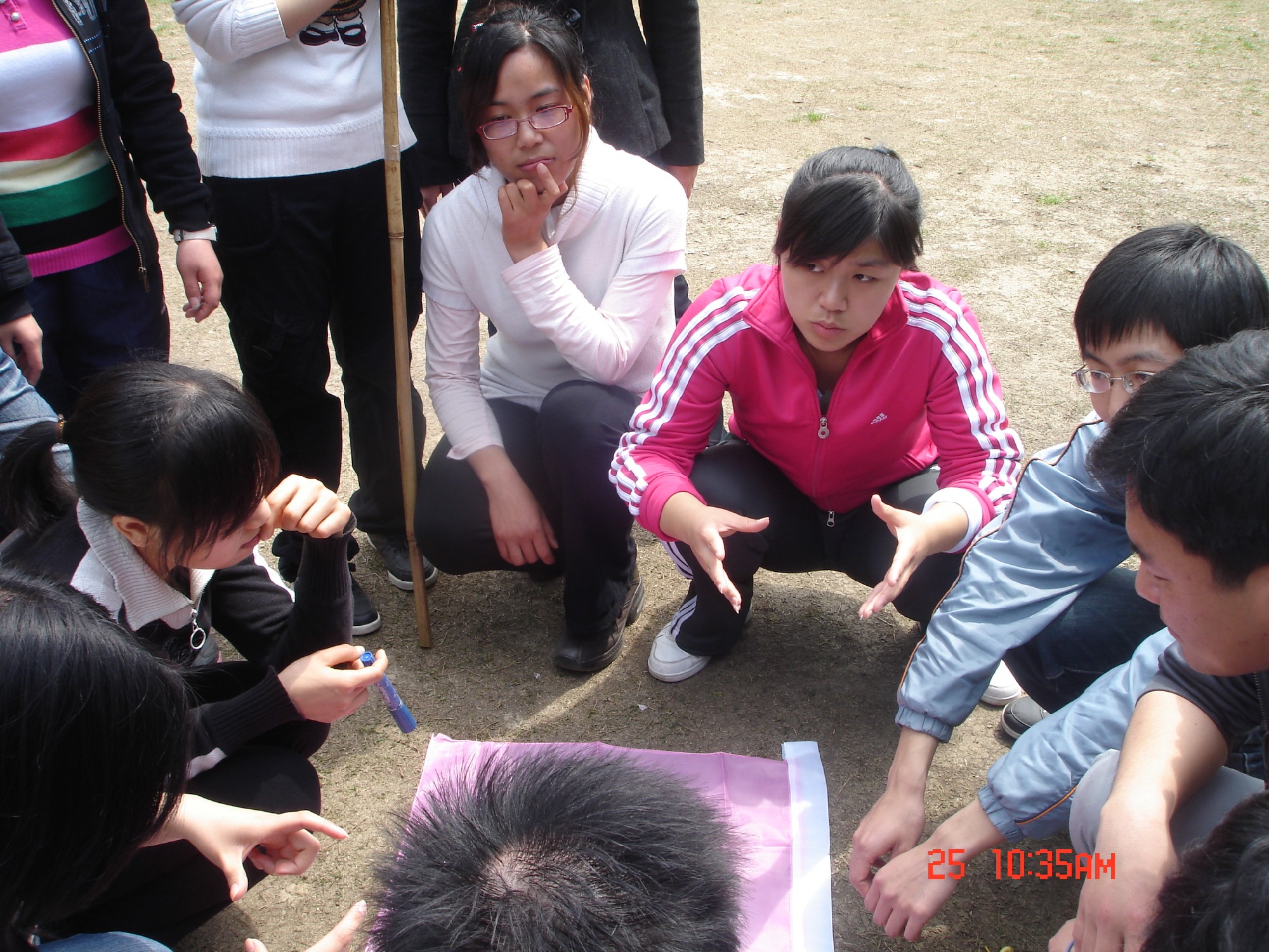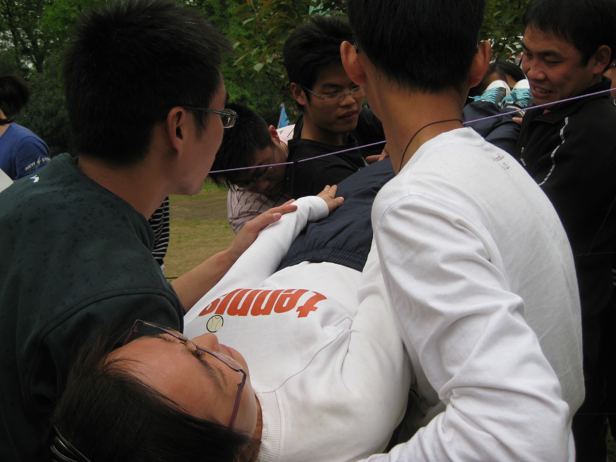 在“高空断桥”项目中,很多同学、尤其是胆子较小的女同学,在平时肯定没有体会过从10米高的地方纵身一跃的感觉。在两队同学不分彼此地鼓励声援之下,大家都顺利过关,不仅实现了物理上的跨越,更完成了对自身意志和勇气的超越。在“信任背推”版块中,由于对体能和抗压力量的要求较高,队伍中的男同学需要扮演主要的角色。在人数相对较少、无法大幅轮换休息的情况下,几位可敬的男同胞硬是咬紧牙关坚持到了最后。在穿越“生死电网”时,面对大大小小、交错复杂的网孔,队员们集思广益,八仙过海各显神通,将个体智慧与团队力量完美结合,最终都成功冲破罗网,完成了任务。