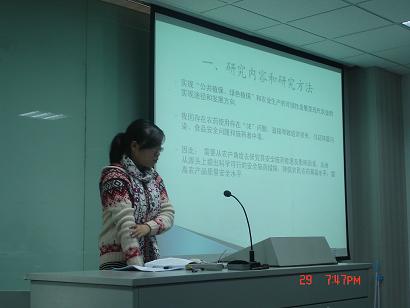 首先上台作报告的是华红娟,其报告的题目是《供应链模式对农户安全生产行为的影响研究——基于江苏省葡萄主产区的调查》,她介绍了近年来江苏省优质水果产业发展取得的明显的进展,本文以鲜食葡萄种植为例,研究供应链组织及其模式对农户安全生产行为的影响。结束后,刘爱军老师对这篇文章进行了详细的点评,指出应该知名文章中安全生产的含义;所取得的样本是否有意义:农户安全生产动机是什么?