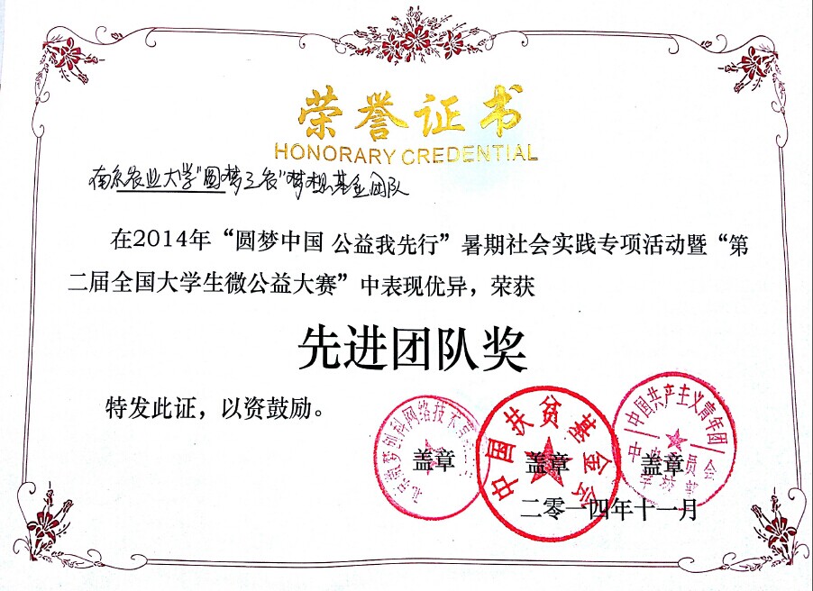 近日,我院学生社会实践团队-“圆梦三农”梦想基金团队在由团中央学校部、中国扶贫基金会、新浪微博主办的2014年“圆梦中国 公益我先行”暑期社会实践专项活动暨第二届全国大学生微公益大赛评选中,荣获先进团队(全国共26支)。“圆梦三农”梦想基金团队由我院农经、国贸、工商等专业学生组成,今年7月,经过项目海选、网络投票和专家评审从全国申报的10 000多项项目中脱颖而出,进入全国百强重点团队,并在后期评选中荣获此佳绩。