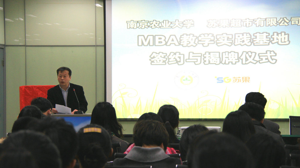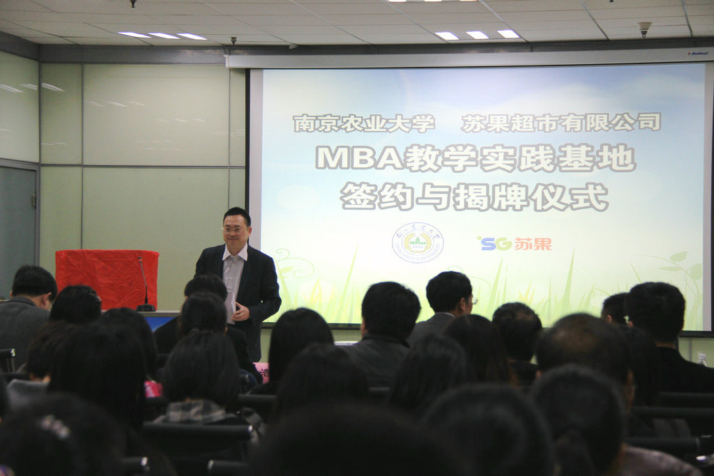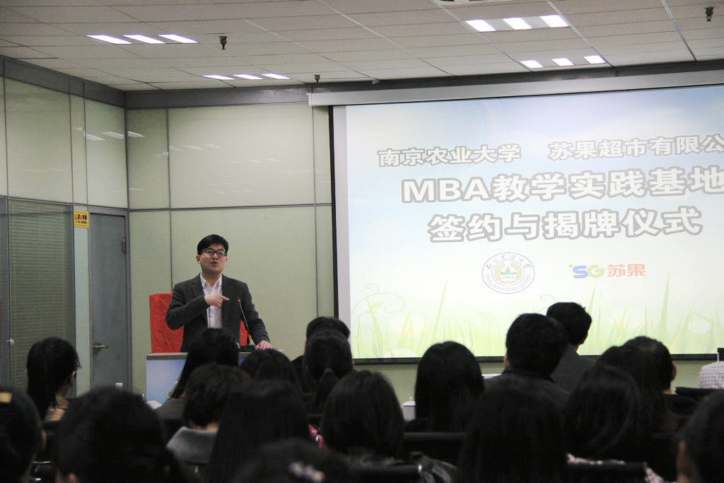 随后,苏果超市股份有限公司张永明副总经理介绍了苏果超市有限公司的基本情况,表示苏果集团在快速发展的过程中,深刻体会到“人”的重要性,实践基地的建立为苏果日后引进高端人才和创新企业管理理念提供了有利的条件,将会极大地促进苏果的发展。他希望bwi437官网的师资力量能为苏果的发展提供人才保障和智力支持,同时表示将创造良好的环境,对实践基地的建设提供支持。张总希望通过本次合作,让南农大MBA走进苏果、了解苏果,锻炼学员们认识与解决实际问题的能力。