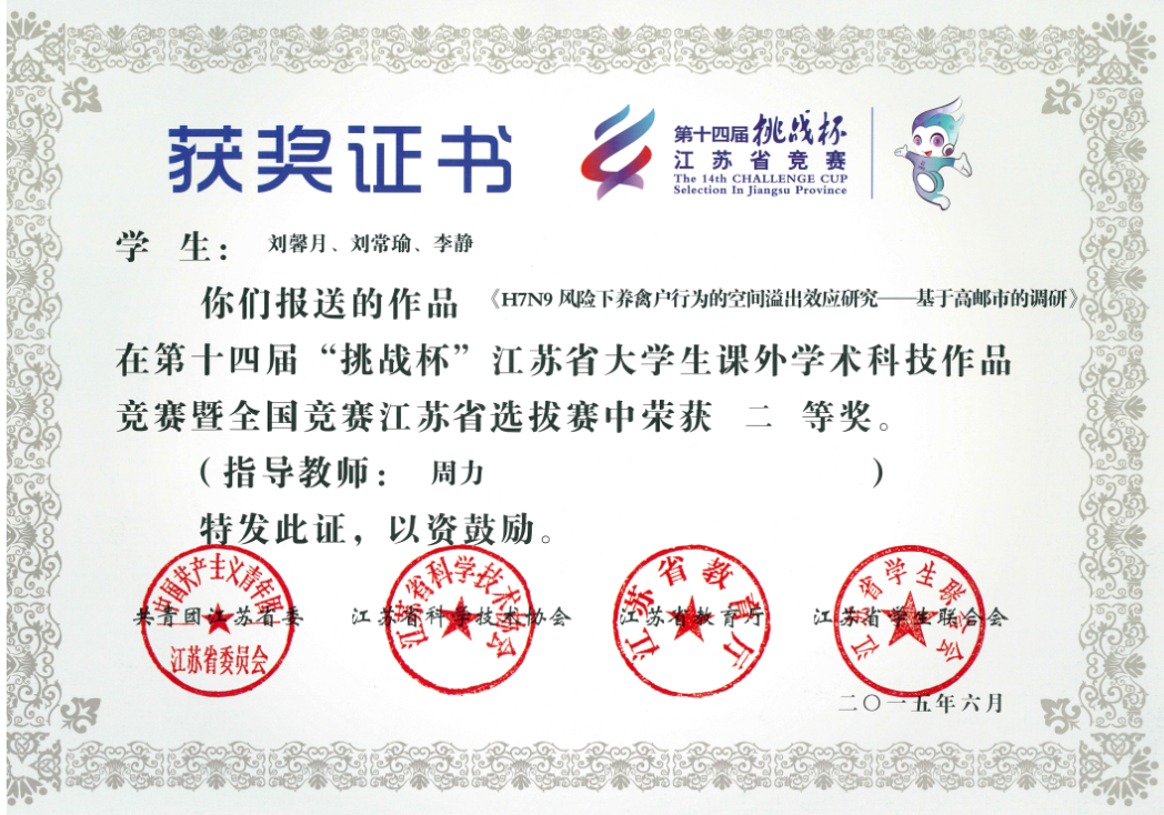 日前,由共青团江苏省委、省科协、省教育厅、省学联主办的第十四届“挑战杯”江苏省大学生课外学术科技作品竞赛落下帷幕,我院周力副教授指导的作品《H7N9风险下养禽户行为的空间溢出效应研究——基于高邮市的调研》(作者:刘馨月、刘常瑜、李静)荣获二等奖,何军教授指导的作品《城镇化进程中的农民身份认同调研报告》(作者:王越、杨浩鹏、涂盟、魏睿、刘鹏飞、庄硕)荣获三等奖,学院获奖数全校第一。