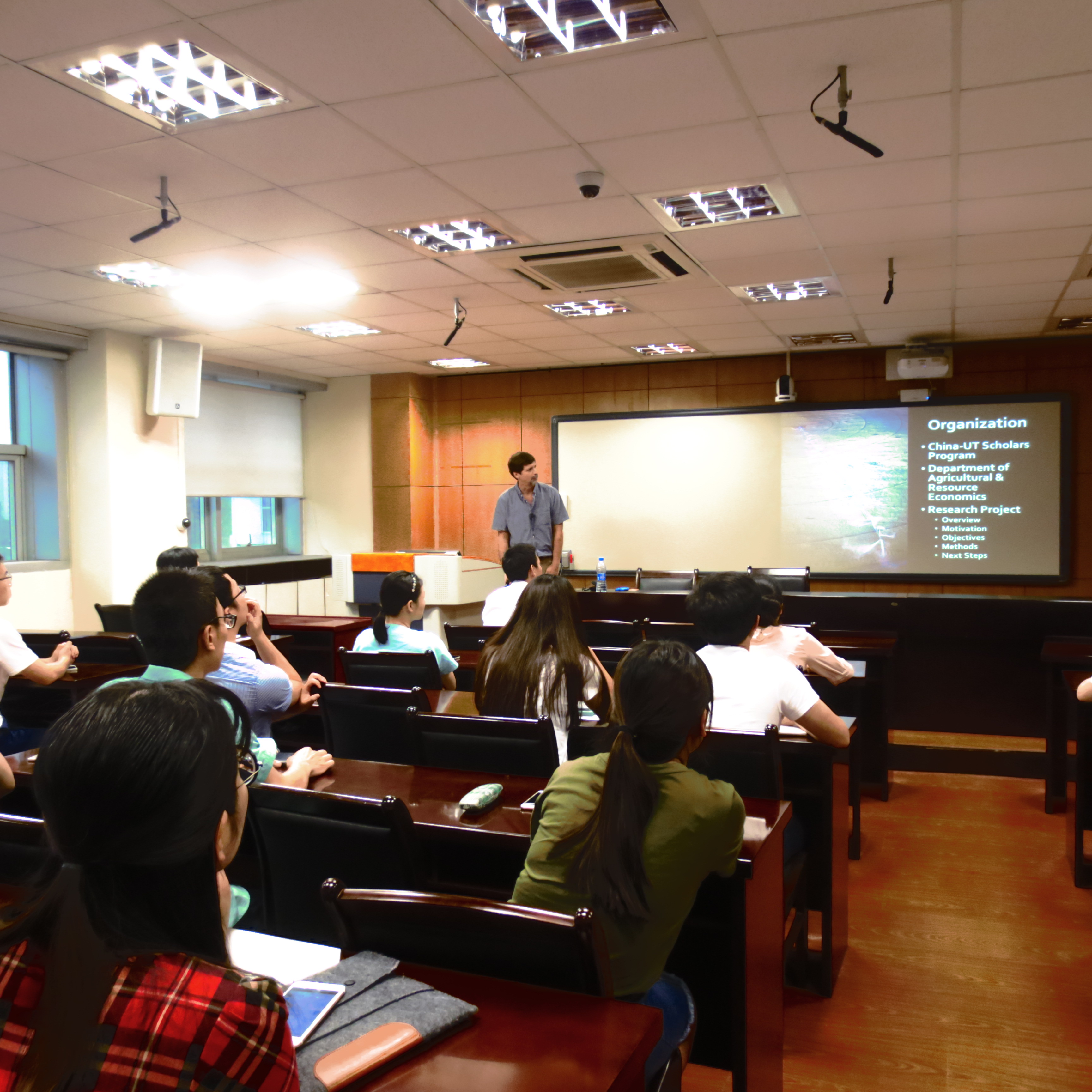 报告开始前,林光华教授简要介绍了Chris教授的情况,并对Chris教授的到访表示热烈欢迎。首先,Chris教授简要说明了中国高校与美国田纳西州立学校的学生交流情况,农业与资源经济部隶属于农业科学与自然资源学院,每年中国约有20名学生申请就读于农业与资源经济部的博士学位,约有3至4名学生可免费攻读博士学位。然后,Chris教授分别从研究背景、研究目的、研究方法及模型构建介绍自己的研究。研究地区是覆盖美国的南部地区,密西西比河的下游、田纳西州和坎伯兰河流域,属于比较潮湿的气候区。研究背景一方面是温度与降雨模式的异常及极端天气事件的频发导致的气候变化,另一方面是基于人口增长、经济发展及农业灌溉用水增加导致的水资源的需求增加。