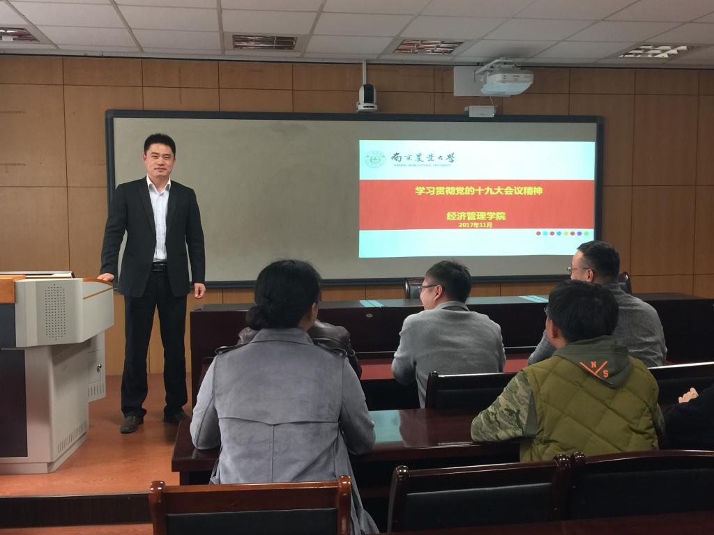 11月8日下午,我院召开教职工大会,组织教职工学习贯彻党的"十九大"精神,会议由院长朱晶主持,学院党委副书记(主持工作)孙雪峰做《学习贯彻党的"十九大"精神》专题讲座。