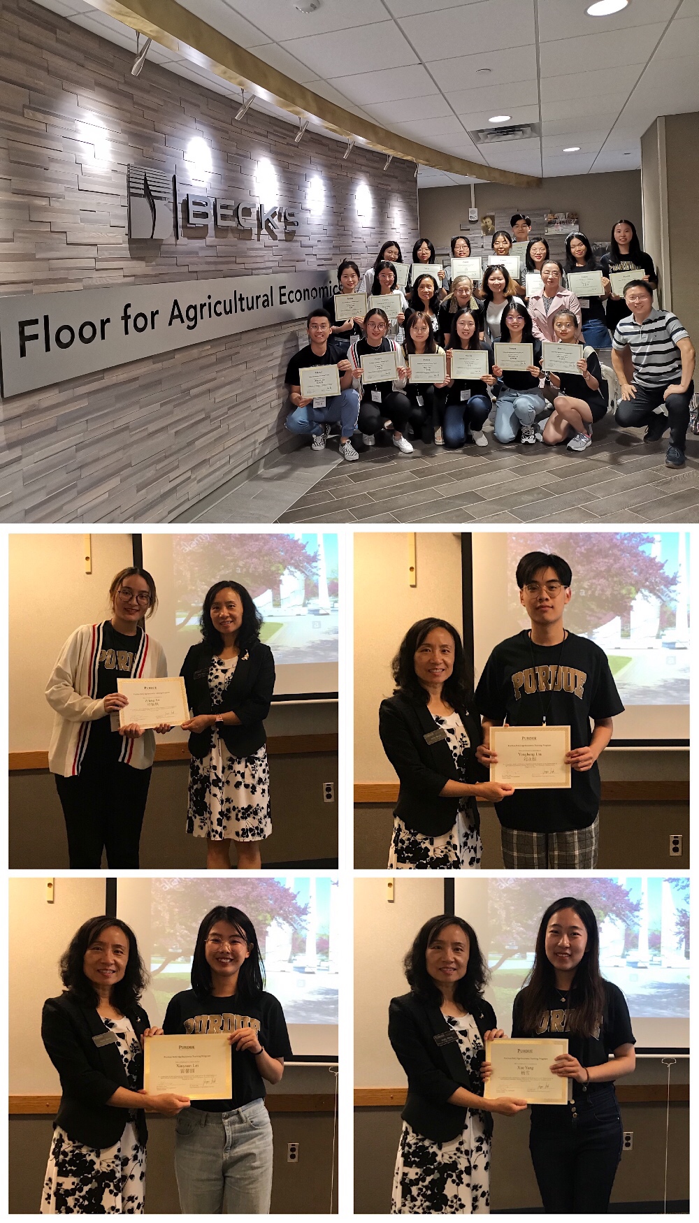 在此次交流活动结业典礼上,我院学生积极发言分享本次访学感悟,普渡大学项目主任Holly Wang教授对我院学生的表现给予高度评价,希望今后能与我院继续开展此类项目,并拓展双方在人才培养、师资培训、科学研究等方面的合作,共同交流两国农业发展问题。展进涛教授及张梅老师代表访学团致辞,感谢普渡大学农经系对本次访学活动的大力支持与精心安排,感谢所有的授课老师和工作人员,尤其是Holly Wang教授为本次访学活动的顺利开展付出的巨大努力,让团队成员受益匪浅,希望双方能够持续开展此类交流活动,在人才培养和科学研究等方面进一步拓展合作空间。最后,Holly Wang教授为同学们一一颁发访学项目证书并合影留恋。