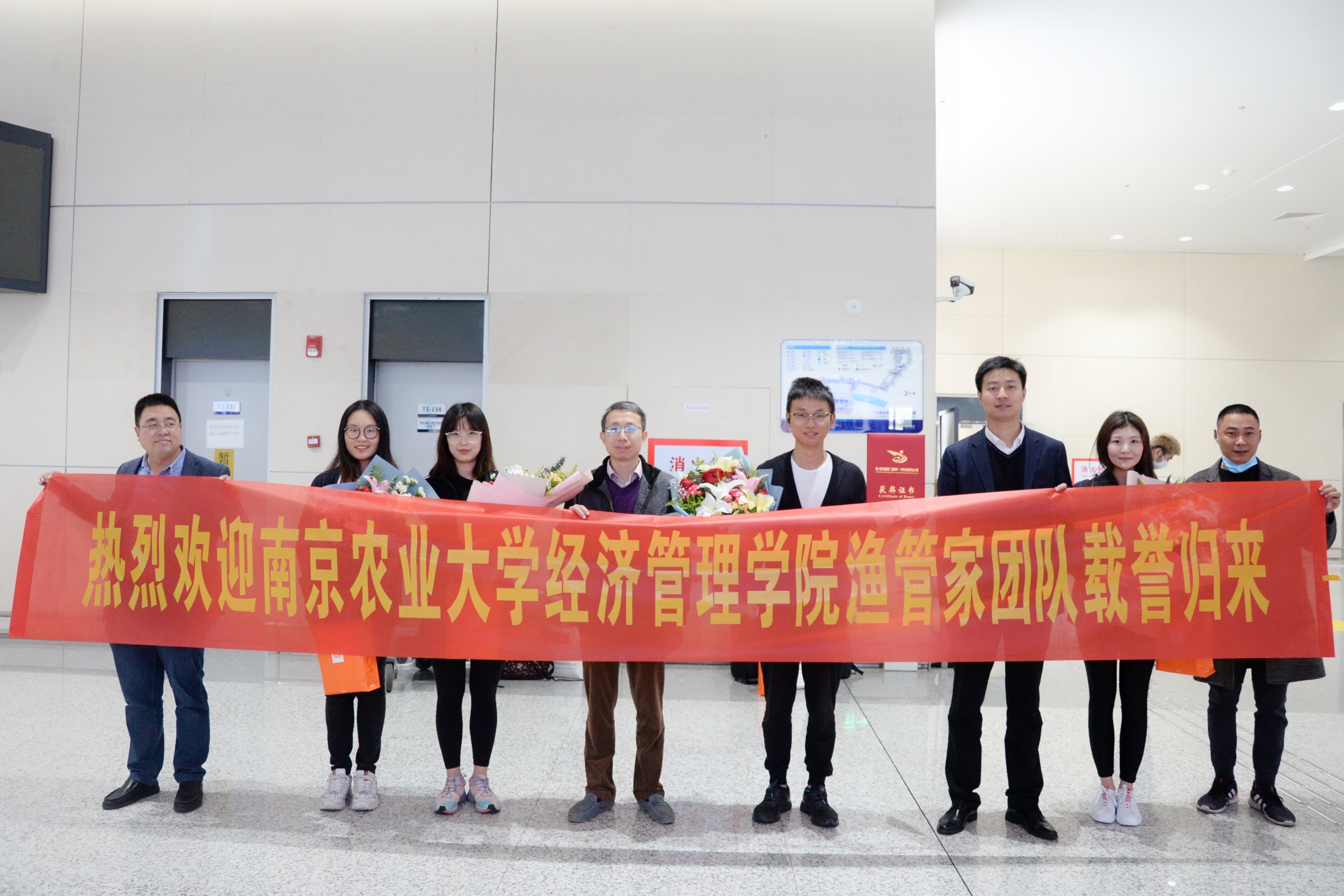 11月20日,我院渔管家团队乘坐着广州直达南京的航班载誉归来。学校团委书记谭智赟、学院党委书记姜海、副书记宋俊峰一行4人前往南京禄口机场接机,并向获奖团队表示热烈祝贺。