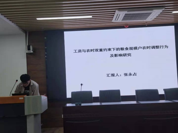 张永占汇报的是《工资与农时双重约束下的粮食规模户农时调整行为及影响研究》。文章通过构建决策模型、产量模型、成本模型和规模经营模型,根据实地调查数据对粮食规模户调整行为的具体约束条件及背后决策机制进行分析。研究结果显示劳动力工资上涨会促使规模户调整作业时间,以躲避用工高峰降低生产成本,农时弹性会对生产决策产生制约。