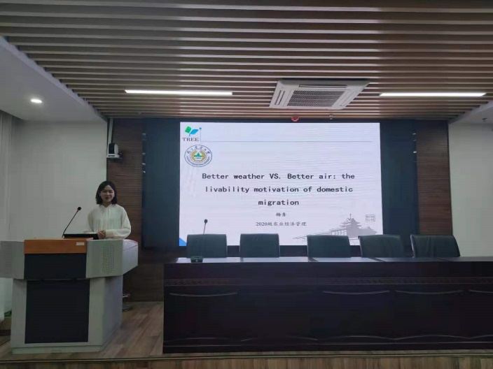 杨青以《Better weather VS. Better air: the livability motivation of domestic migration》为题进行汇报,该文章从空气污染切入,探讨气候变化与空气污染对人类迁移的综合作用。研究采用二元logit模型分析气候变化和空气污染对人类迁移行为的综合作用,探究影响现阶段人口迁移的关键环境因素。为中国政府以及其他国家的全球环境治理工作提供参考,具有现实意义。