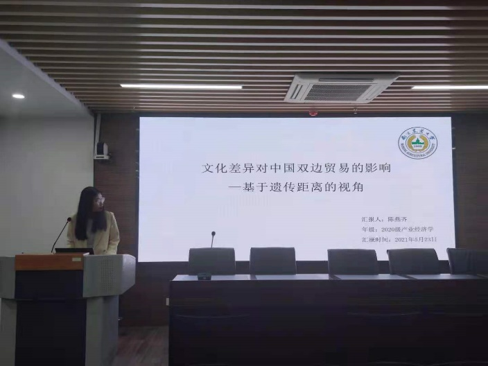 陈燕齐同学汇报的是《文化差异对中国双边贸易的影响——基于遗传距离的视角》。文章选择静态指标“遗传距离”作为文化差异的代理变量,以较大程度地缓解内生性带来的估计偏误。同时选取农产品、纺织品、文化产品这三类具有代表性的商品来研究文化差异对贸易影响的行业异质性。最后,基于动态视角,考察文化差异对中国双边贸易影响的时间趋势。