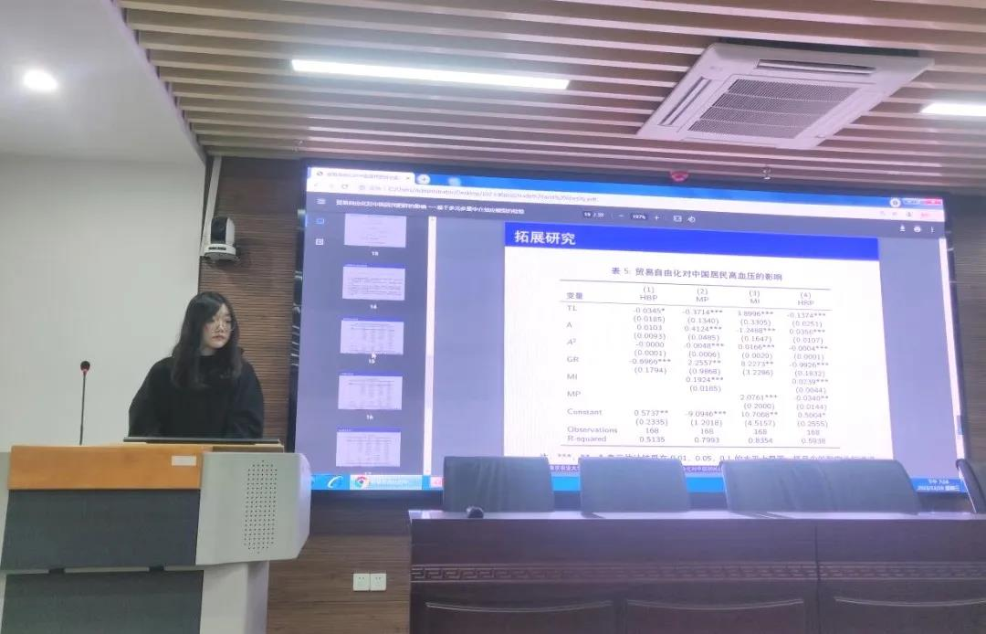 崔蓉蓉同学汇报的是《贸易自由化对中国居民肥胖的影响——基于多元多重中介效应模型的检验》,基于贸易自由化的视角,引入收入和价格两个中介变量,利用中国影响与健康调查得到的12个省市、自1989年到2015年的10年不连续居民健康数据,通过多元多重中介效应模型,从理论和实证上分析了贸易自由化对中国居民肥胖的影响及路径。