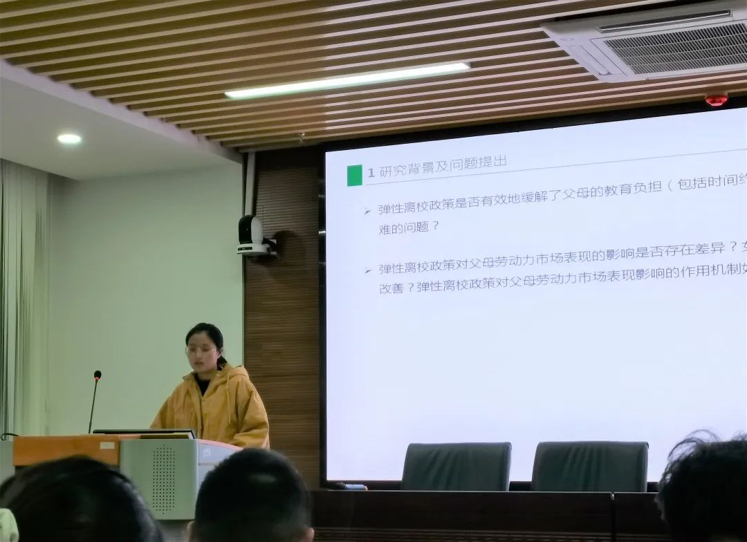 任娜同学汇报的是《弹性离校政策对父母劳动力市场表现的影响——基于放学时间约束中介效应的考察》,利用微观调查数据,研究弹性离校政策对父母劳动力市场表现的影响,并考察作用机制。研究结论对于全面推进“三孩政策”及“双减”政策、化解女性“工作-家庭”冲突、改善女性劳动力市场表现具有一定的借鉴意义。