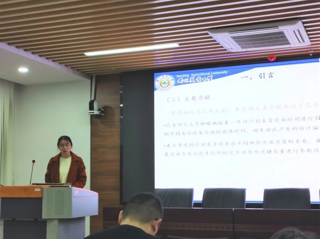 安宁同学汇报的是《人口政策与教育不平等—基于城乡差异和性别差异视角》,研究以计划生育政策为例,检验人口政策的实施是否会对教育不平等产生影响,为全面评估人口政策对教育的影响提供了有益的补充,也为三胎政策实施的同时要兼顾教育均衡发展提供了经验性借鉴和启示。