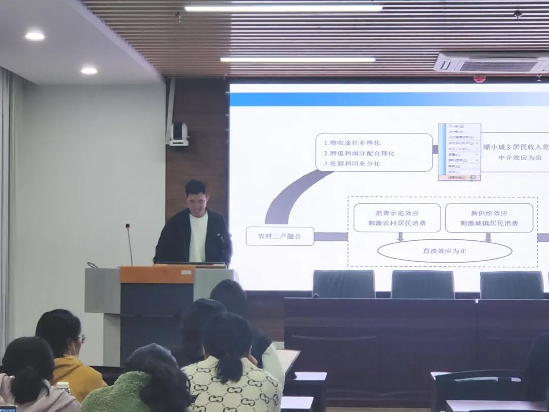 王猛同学汇报的是《效率与公平能否兼得?——农村三产融合、城乡居民消费与收入差距》,文章将消费增长作为经济发展中的效率问题,将收入差距作为社会发展中的公平问题,基于我国2011-2018年省际面板数据和系统GMM方法,验证了三产融合对城乡居民消费的积极影响,并发现三产融合能够通过缩小城乡居民收入差距这一间接机制来促进居民消费。研究结果表明,从宏观层面上来说三产融合能够兼顾效率与公平,而非“折腾乡村”,其在乡村振兴战略中将继续发挥重要作用。