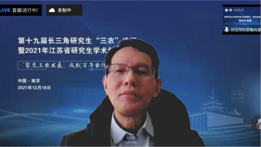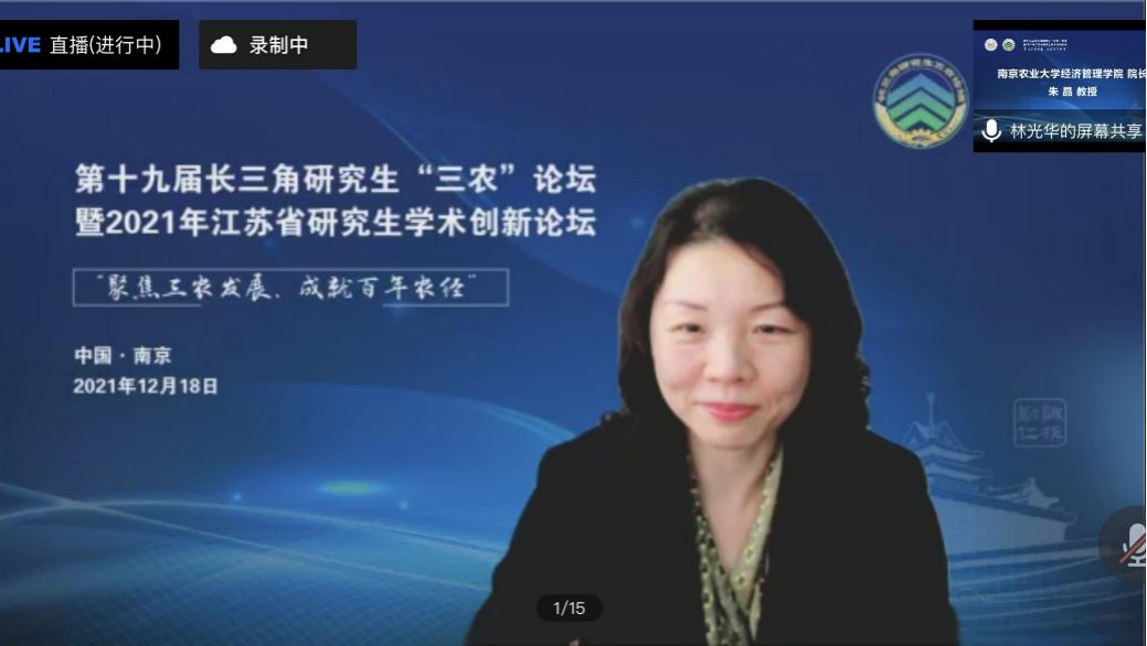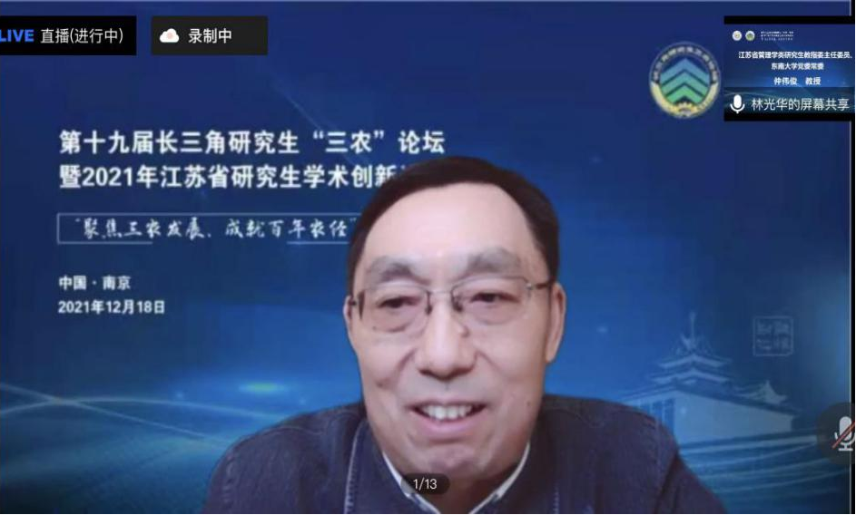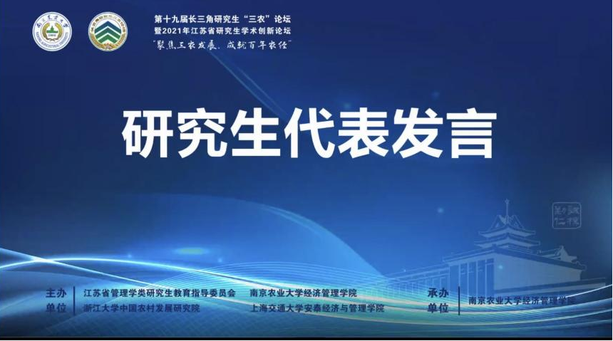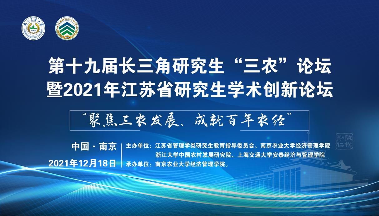 2021年12月18日,第十九届长三角研究生“三农”论坛暨2021年江苏省研究生“聚焦三农发展,成就百年农经”学术创新论坛在线上举行。此次论坛由江苏省管理学类研究生教育指导委员会、437必赢会员中心、浙江大学中国农村发展研究院、上海交通大学安泰经济与管理学院共同主办,437必赢会员中心承办,437必赢会员中心研究生会协办。浙江大学、上海交通大学、bwi437官网、福建农林大学、安徽农业大学、江西农业大学等19所院校、80余名师生代表参加,来自全国高校300多名同学在线旁听了会议。