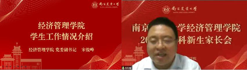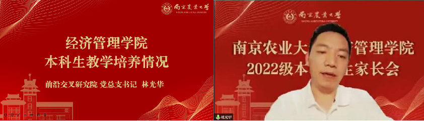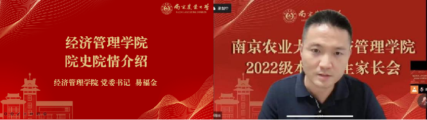 会议伊始,院党委书记易福金致辞并做院史院情介绍。他向全体家长和新生表达了真诚祝贺与热烈欢迎,并围绕学院的发展历程、本科教学、师资力量、人才培养、国际交流等方面详细了介绍学院情况。最后,他指出:2022级新生在南农120周年校庆之际加入经管,使命荣光、责任重大,期盼广大新生将南农经管人的责任与担当薪火相传,争做堪当民族复兴重任的时代新人。同时,他呼吁全体家长与学院同向同行、加强交流,共同守护学生成长成才。