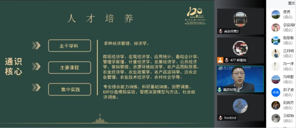 展进涛做农林经济管理专业宣讲。他从农经专业的百年历史讲起,详细介绍了农林经济管理专业的学科实力、专业概况、核心课程、培养目标、就业前景等内容。讲座最后,他针对学生们较为关心的学科特色、选课要求、招生计划等提问一一进行解答,并向师生家长播放农经经济管理专业宣传片。他寄语同学们,秉承三农情怀,立足国际视角,勇担青年使命,做新时代农经人。