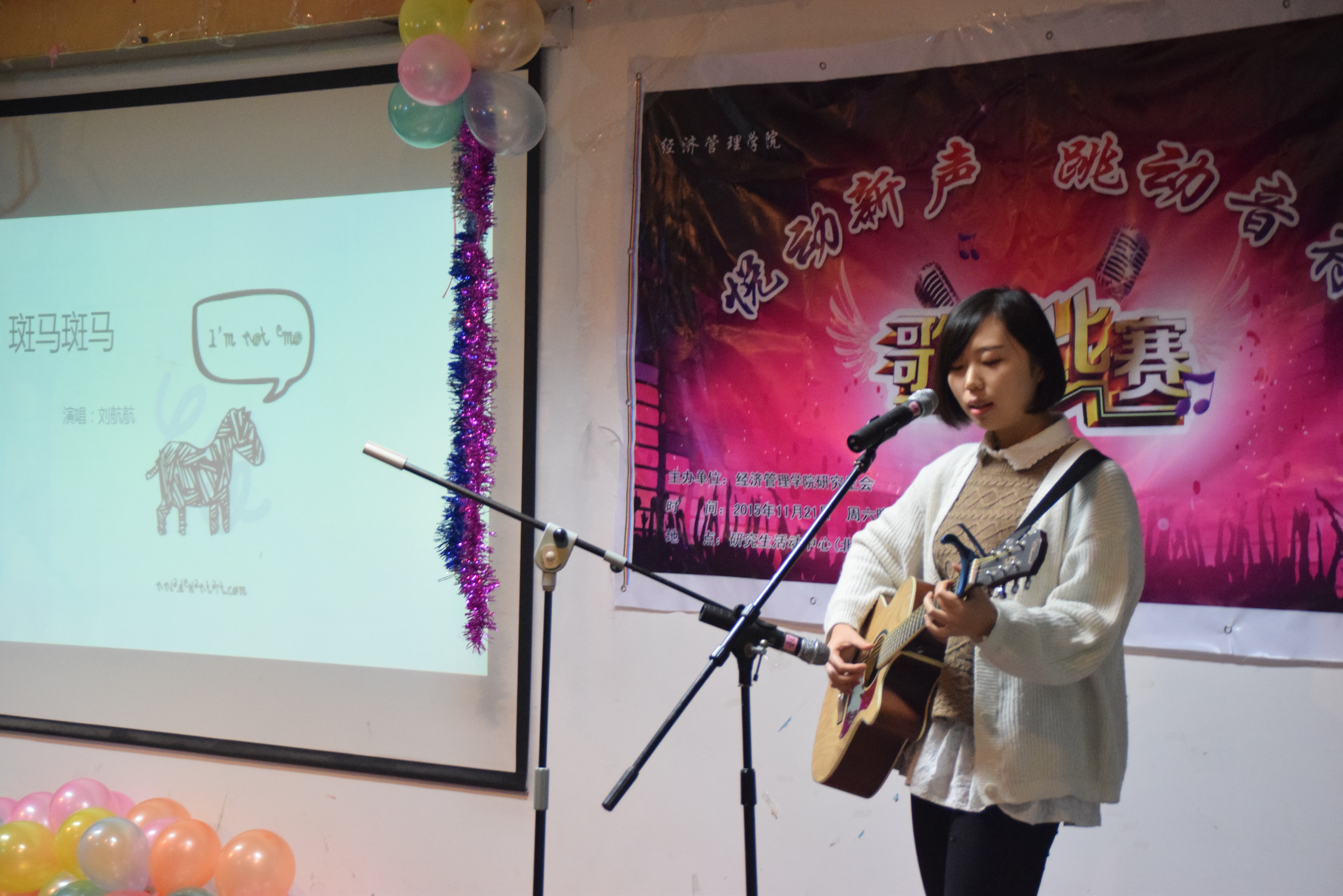伴随着动感欢快的音乐,一段青春洋溢的舞蹈拉开本次比赛的序幕,出席本次活动的嘉宾有经管院党委副书记卢忠菊老师、经管院研究生辅导员张杨老师、经管院本科生辅导员施培菊老师及校研会副主席林延胜同学,主持人首先向四位嘉宾的到来表示热烈欢迎,接下来比赛正式开始。比赛共分为两轮,选手需要逐轮演唱来角逐最后的奖项与名次。第一轮是自选独唱环节,六位选手依次演唱,评委打分排出名次。每位选手在舞台上都勇敢的秀出自己,来自技术经济与管理专业的钱悦选手首先带来的的是一首欢快的《睫毛弯弯》,她用甜美的嗓音征服了在场的观众,赢来阵阵掌声。第二位选手是来自农村区域发展专业的金宇,他带来的曲目是《十年》,当朋友的问候无法升华为恋人间的亲密,看似唱的云淡风轻,而观众听出些许的遗憾与无奈,赢得了在场观众的热烈反响。紧接着,来自农业经济管理专业的刘航航才华横溢,背着吉他自弹自唱《斑马斑马》,本身特有的嗓音赋予了歌曲特别的味道,表达了自己随性自由的态度,让在场的观众也沉醉其中。