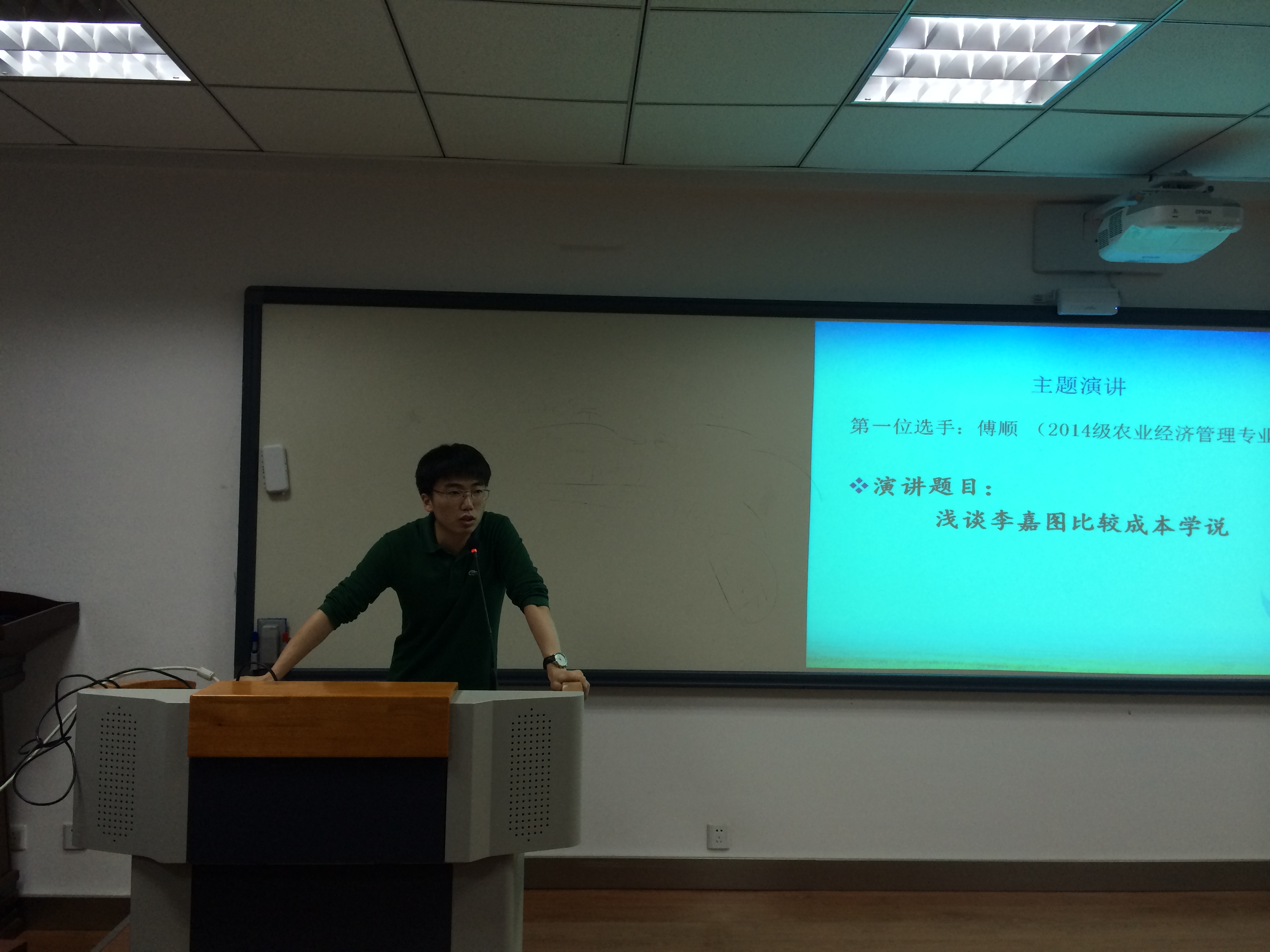 首先在主题演讲环节,第一位参赛选手是14级农经专业的傅顺,演讲题目“浅谈李嘉图比较成本学说”,内容涉及到我国在国际分工上的比较优势等;第二位选手是15级产经专业佘正昊,参赛题目“马克思关于自由贸易的思想”,马克思认为先有国际贸易再有分工;第三位选手是15级国际商务专业王萍,演讲题目“经济学十大原理”,王萍同学用英文围绕资源分配、边际收益、政府与市场等经济学的十大原理展开讲述。第四位选手是14级国贸专业李晓勤,演讲题目是“《资本论》中的生态思想 ”,以《资本论》为例,对生态思想进行探索。第五位选手15级产业经济学专业徐璐,演讲题目“劳动力市场歧视的衡量”,谈到不同人种在就业时是否存在歧视,工资的差别是否是歧视造成的等问题。最后一位选手是来自15级农经专业的选手王含露,演讲题目“看不见的手:‘自身利益和公众利益矛盾吗’”,内容涉及到《国富论》中的道德思想、利益问题等,王含露同学通过声情并茂的演讲表达了自己对于自身利益和公众利益之间关系的思考。