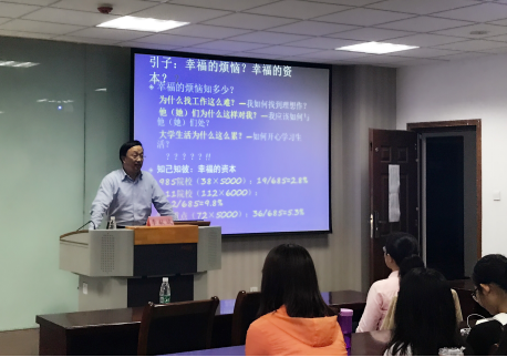 讲座开始,李献斌以“幸福的烦恼知多少”为引子,分析了大学生不快乐的原因,建议在以后的生活学习中,培养自己的自信心,保持乐观积极的心态。讲座过程中,李献斌循序渐进,通过与同学们的互动了解学生心理状态,并用生动的案例对积极心理学进行了详细阐释。